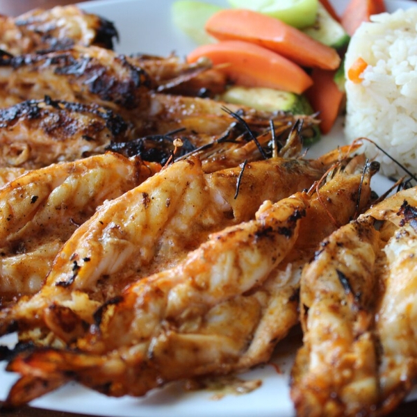 Camarón con cascará y cabeza, bañados en salsa zarandeada. Se sirven con arroz a la mantequilla y ensalada.