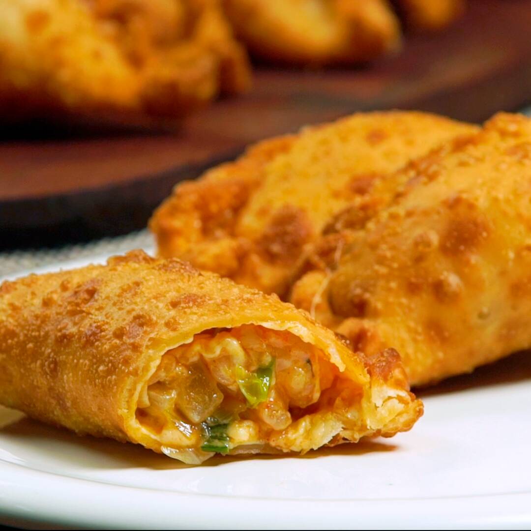Doradito por fuera, relleno de queso y guisado de camarón.