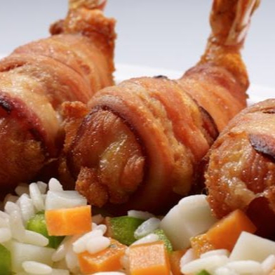 Rellenos de queso, envueltos en tocino. Se sirven con ensalada y arroz a la mantequilla.