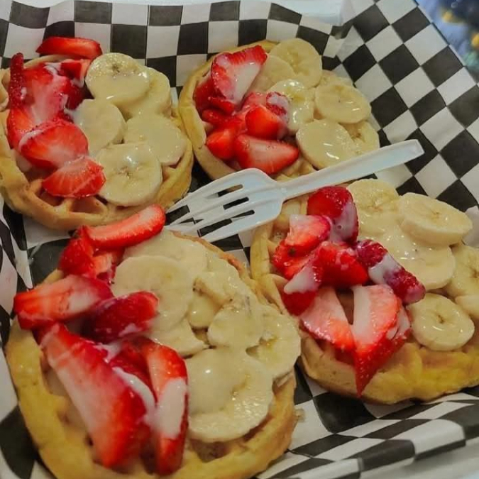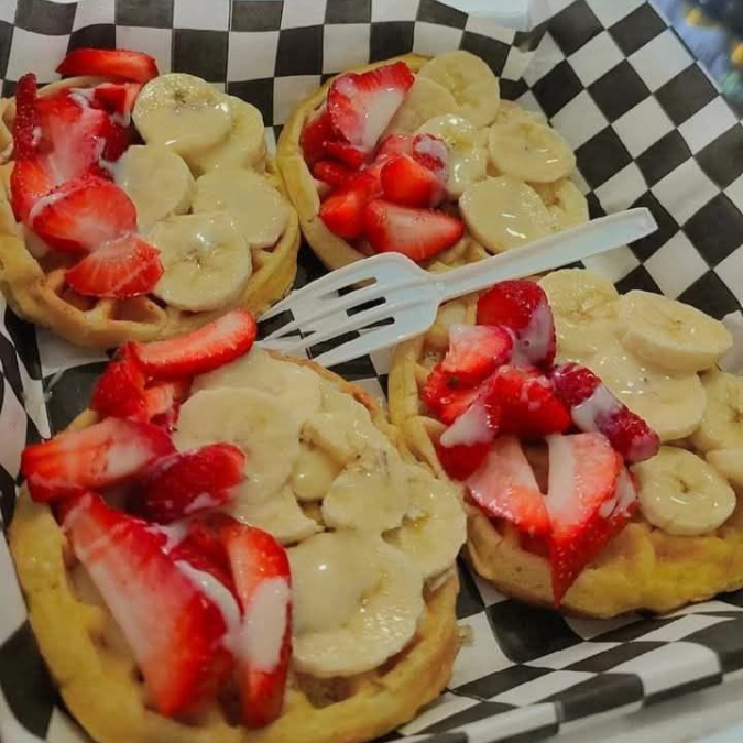 Tres waffles preparados al momento acompañados de fruta natural y un topping dulce.