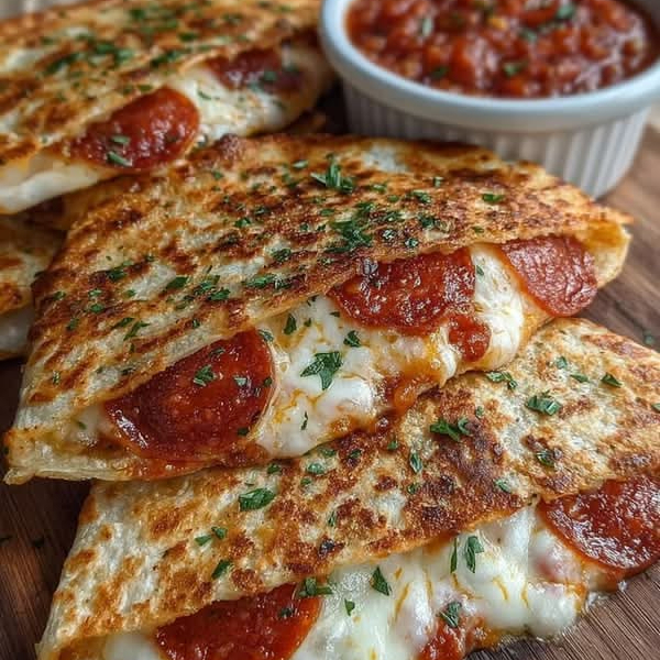 crepa suave rellena de salsa de pizza, pepperoni y queso cheddar derretido.
