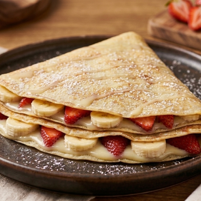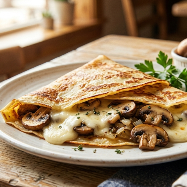crepa suave rellena de champiñones salteados, queso Philadelphia cremoso y queso cheddar derretido, una combinación cremosa y llena de sabor.