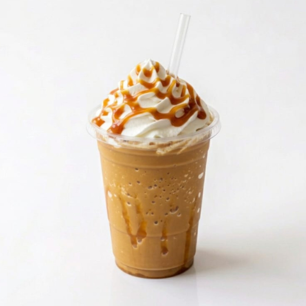 Delicioso café helado tipo frappé con un toque intenso de jarabe de caramelo. Incluye topping de crema batida y más caramelo líquido por dentro y por fuera del vaso.