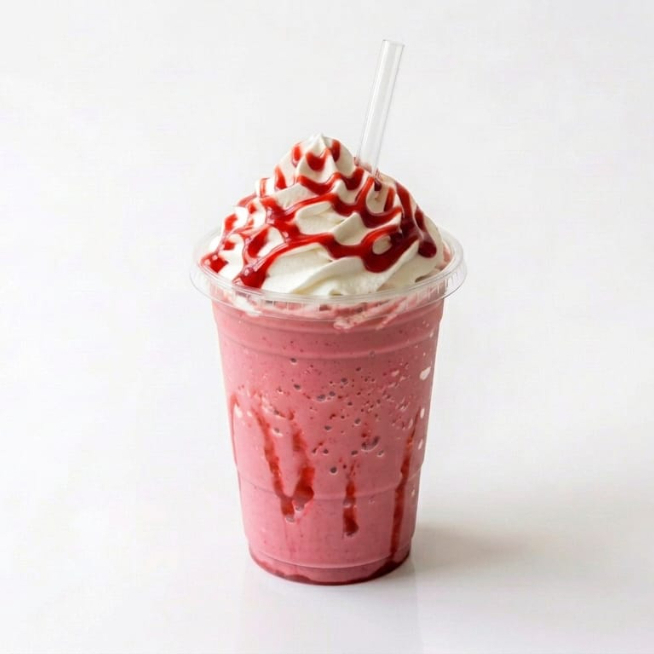 Batido espeso de helado de fresa. Servida con crema batida y espiral de fresa.