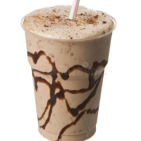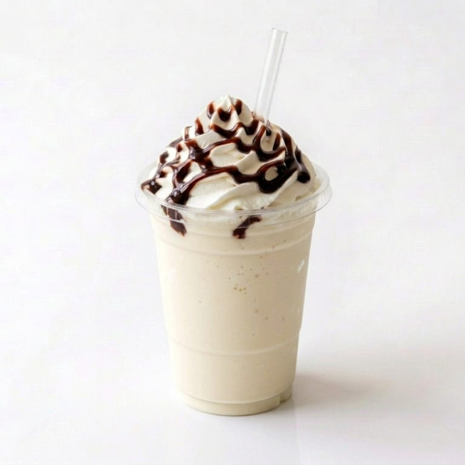 Batido espeso de helado de vainilla. Servida con crema batida y espiral de chocolate.