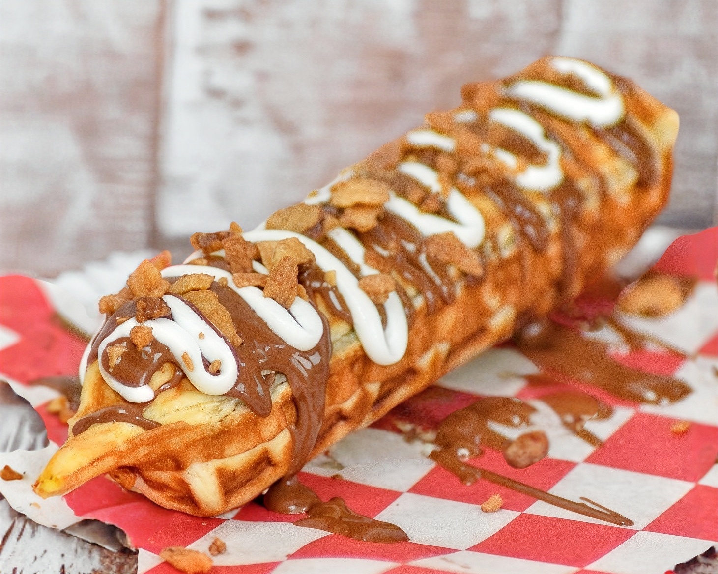 Waffle en forma de paleta, viene relleno con queso Philadelphia.