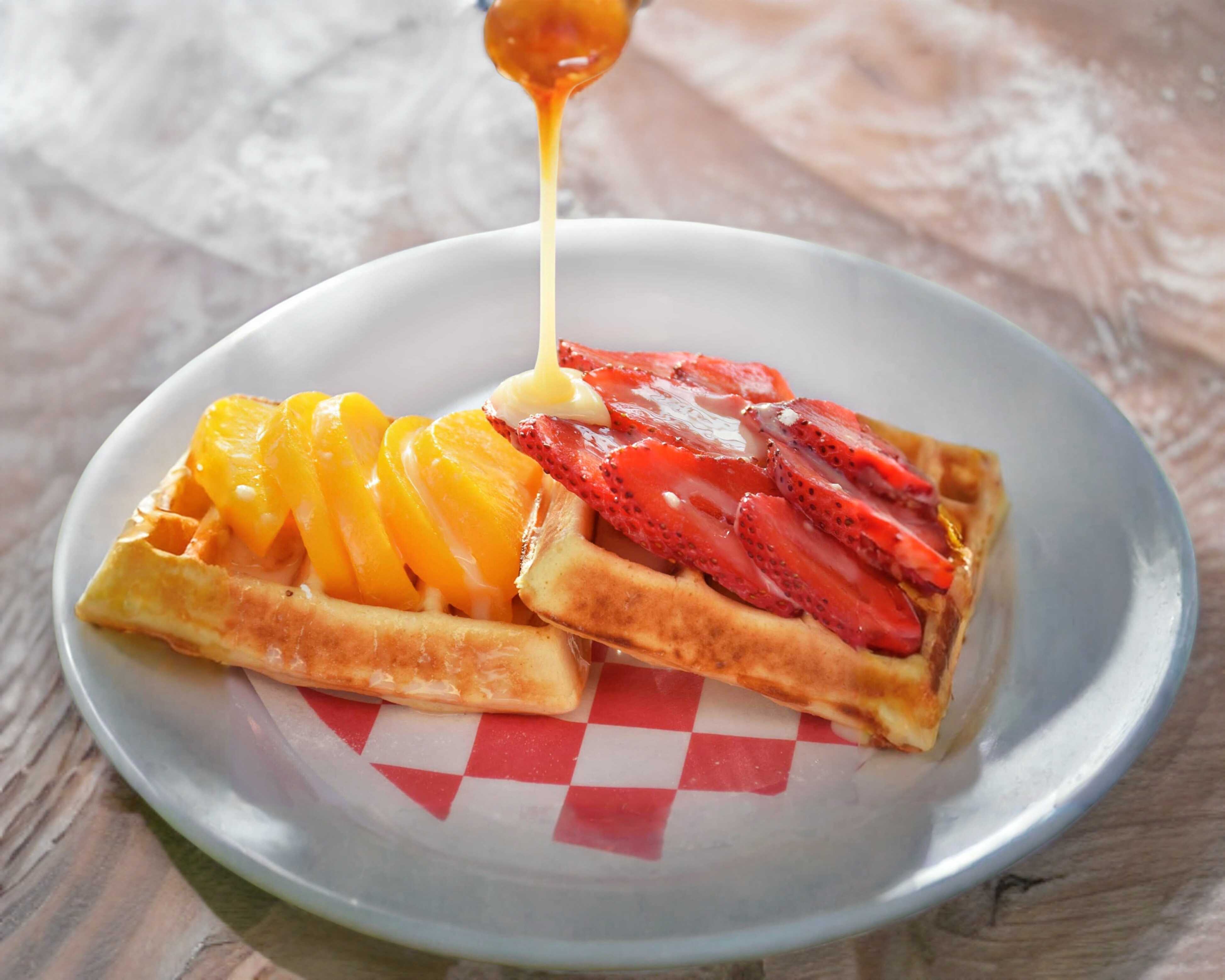 Porción personal: Exquisito par de waffles, puedes agregar hasta 2 ingredientes que no sean fruta natural.