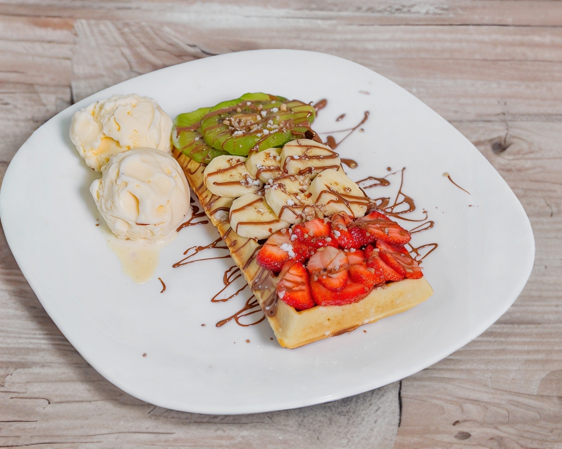 Exquisito par de waffles con 2 bolas de helado de vainilla, agrega hasta 2 ingredientes y 2 frutas naturales.
