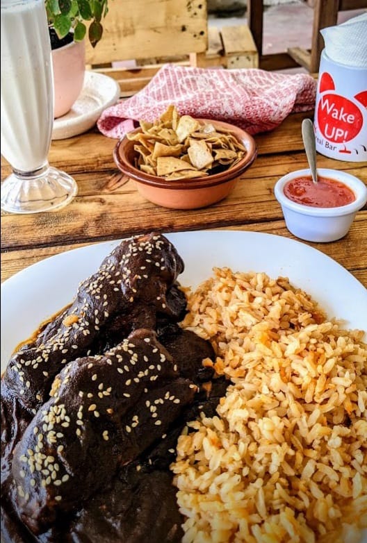 pierna y muslo en mole almendrado mas 2 guarniciones