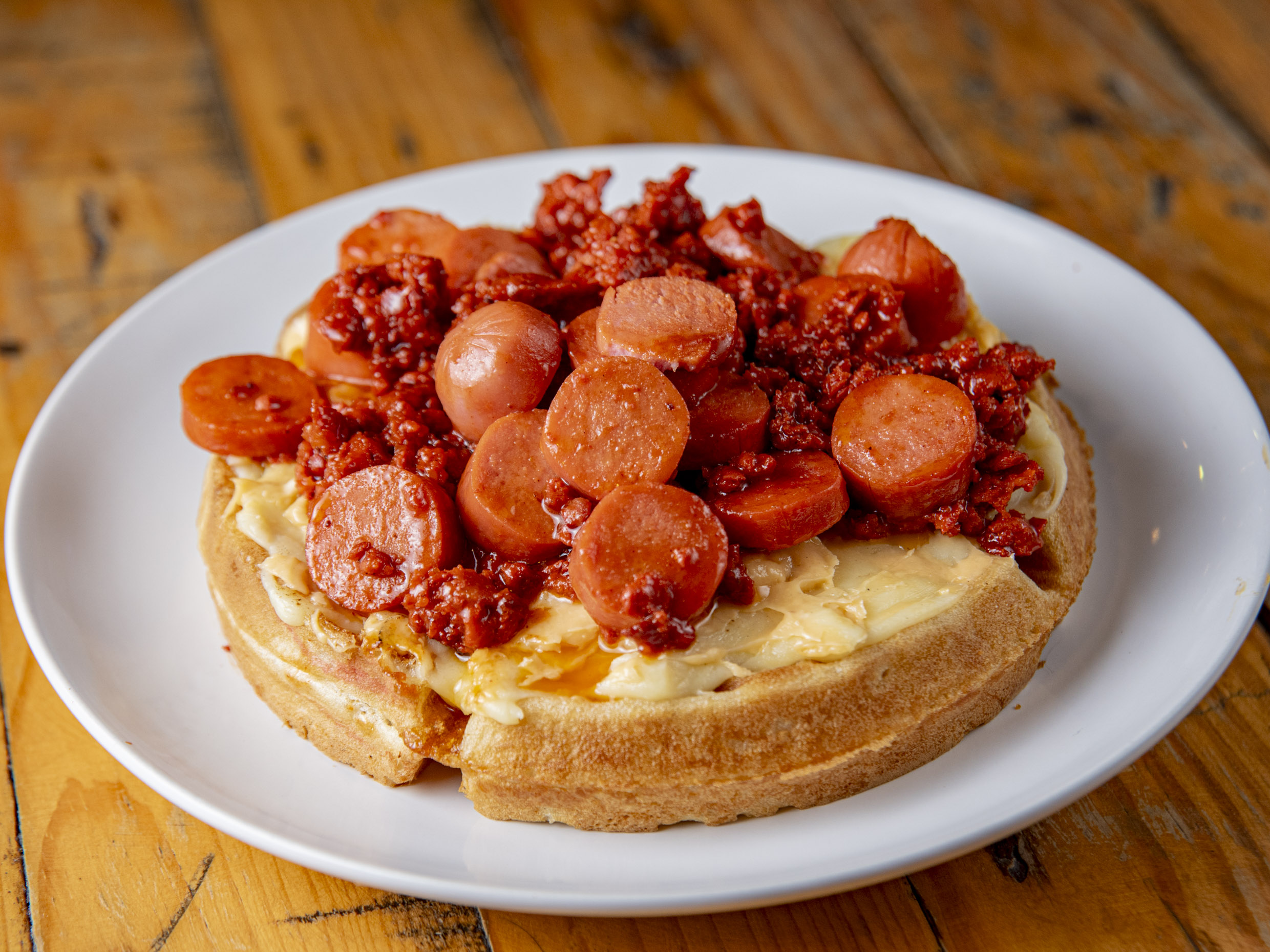 Queso fundido, salchicha, chorizo, salsa hot BBQ.