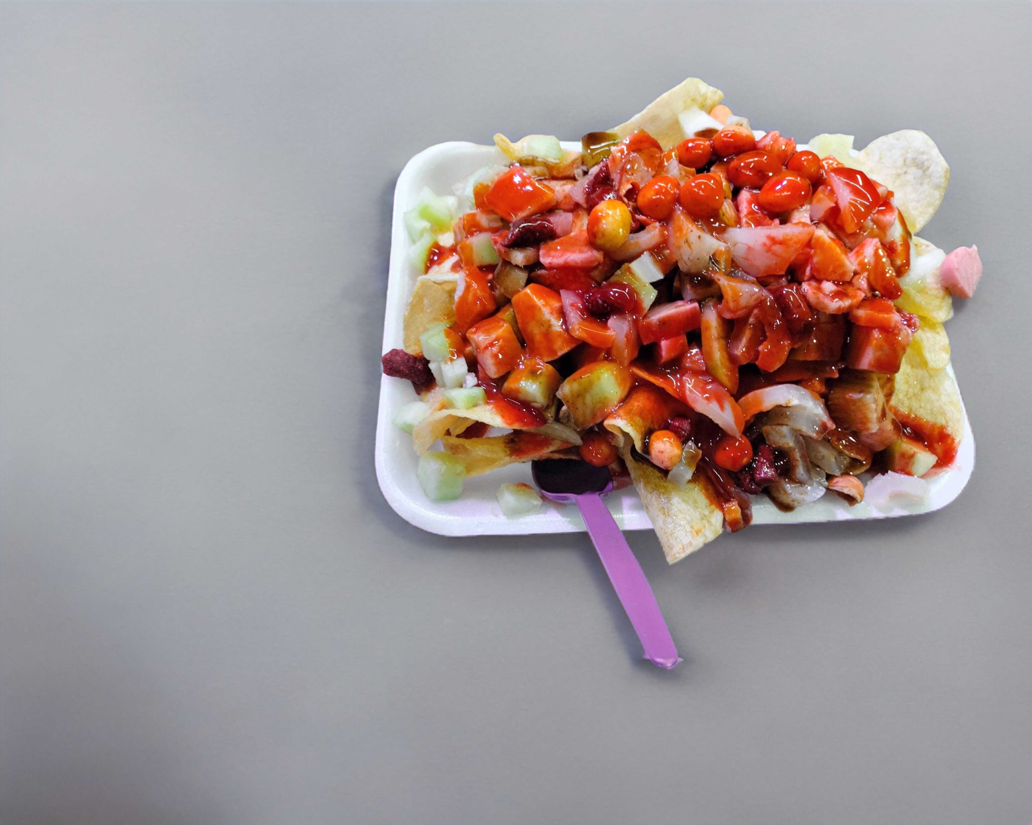 Maruchan, elote con crema, queso y mayonesa y papas al gusto