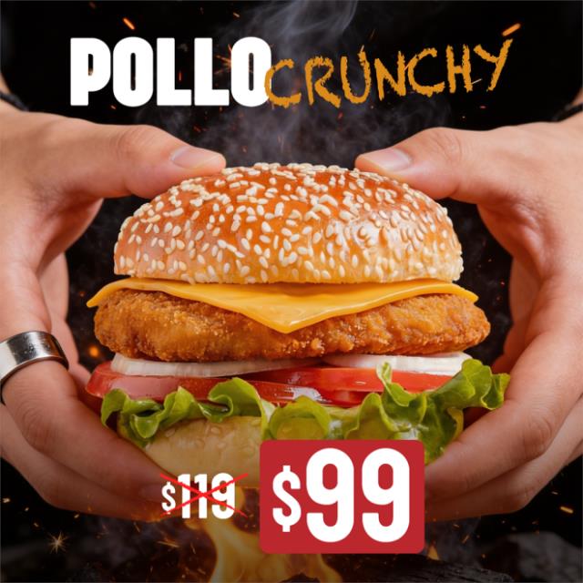 Hamburguesa de pollo crunchy de 125 g con queso fundido, acompañada de lechuga, jitomate y cebolla. Puedes pedirla bañada en Aderezo BBQ o Habanero.