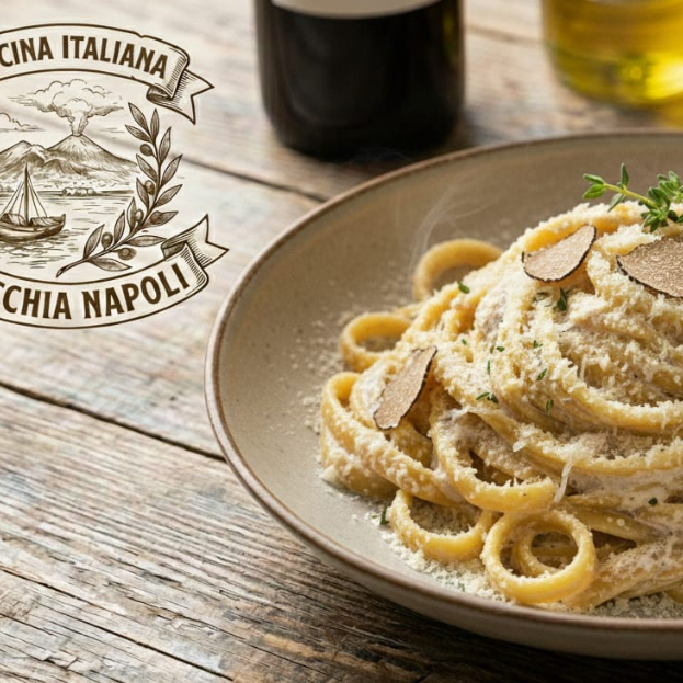 La máxima expresión del lujo rústico. Pasta al dente bañada en una sedosa crema de trufa negra y hongos silvestres, terminada con un toque de parmesano que realza su aroma terroso.