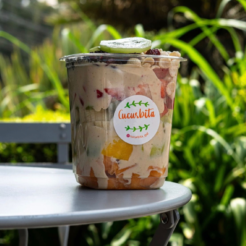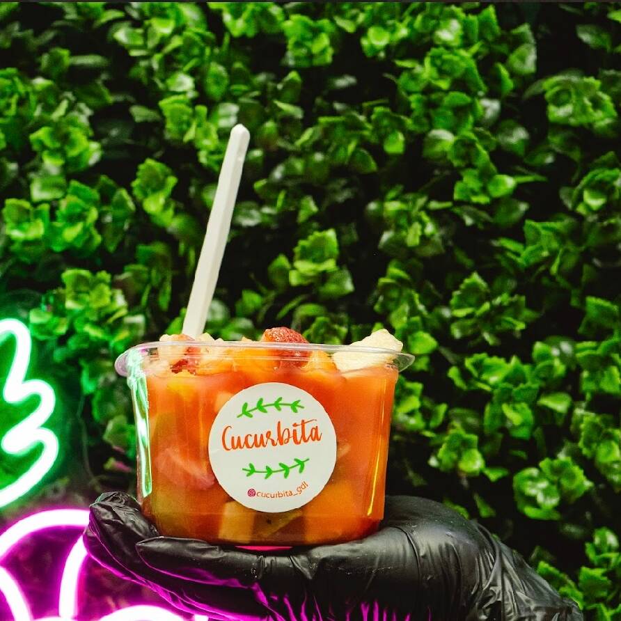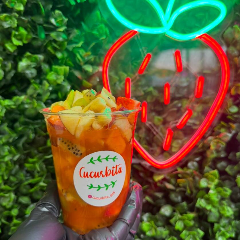 Coctel de frutas (melón, papaya, piña, guayaba, manzana, fresa, uva, kiwi, plátano), a base de jugo y granadina.