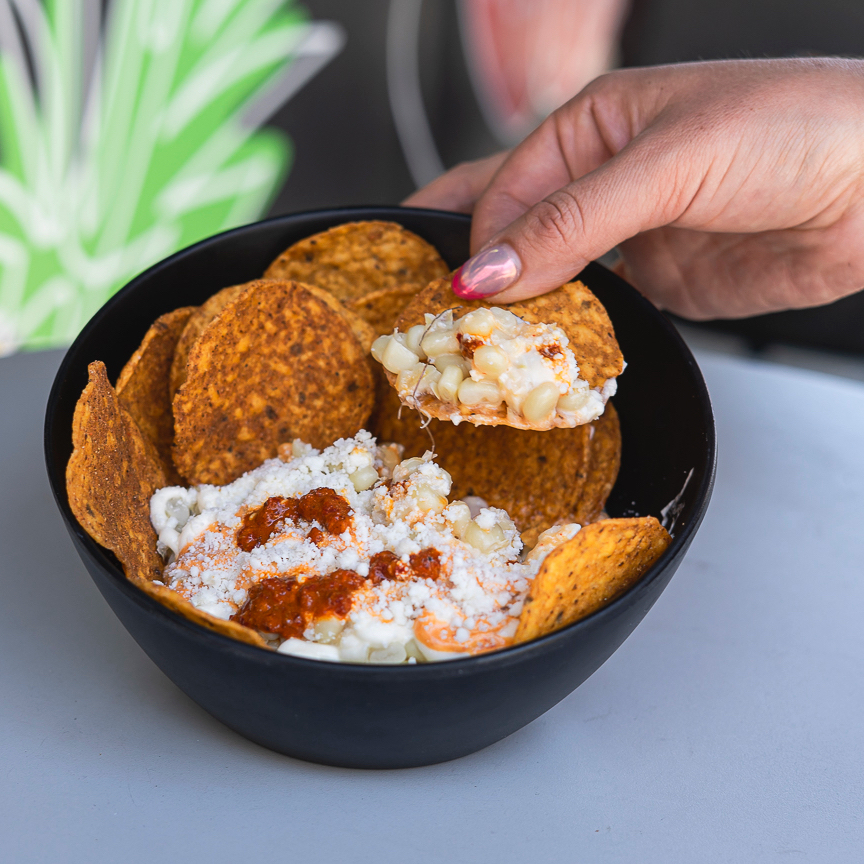 Deliciosos tostitos, preparados con elote, queso, crema y chipotle.