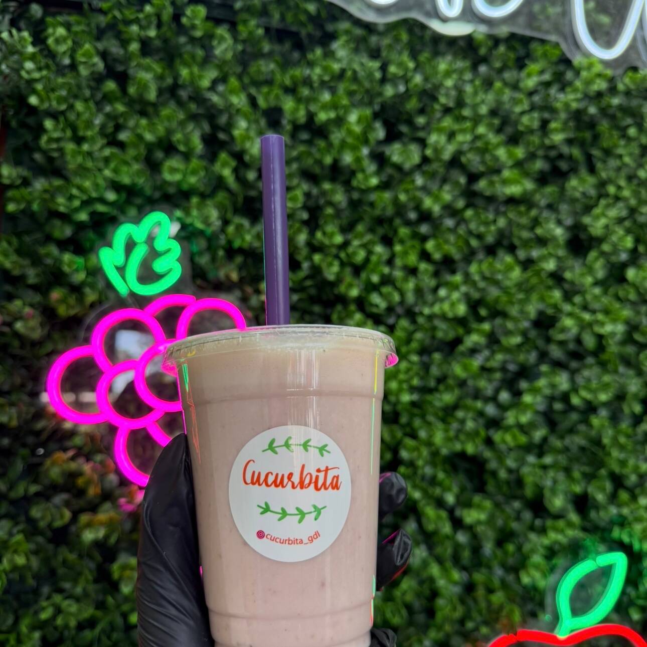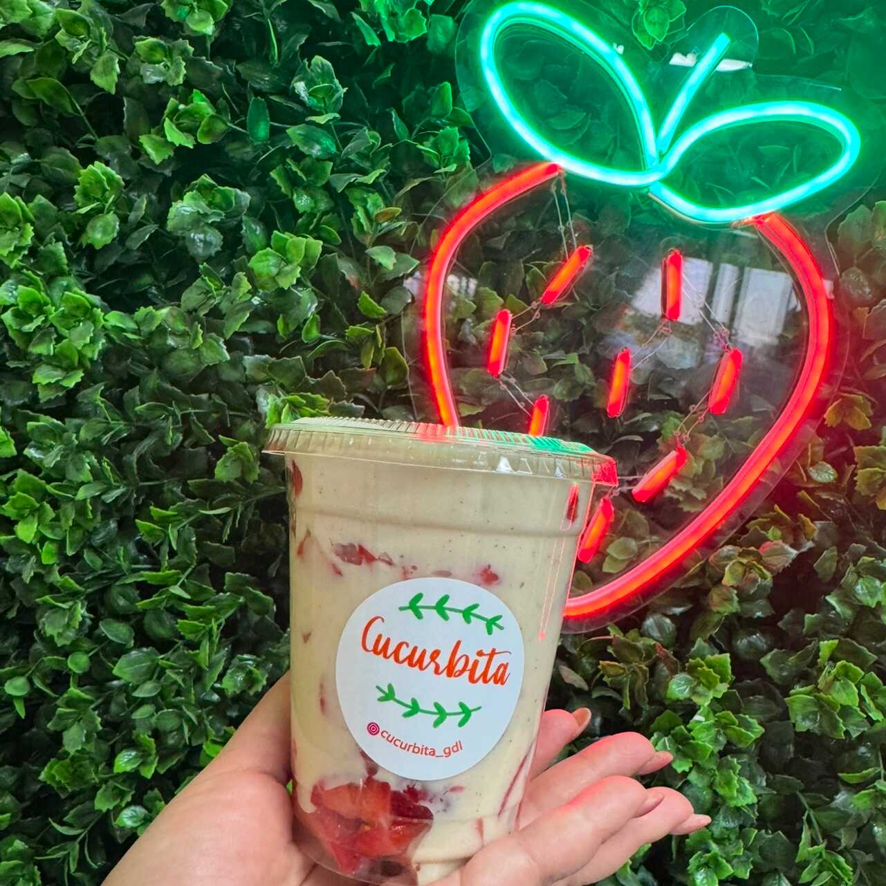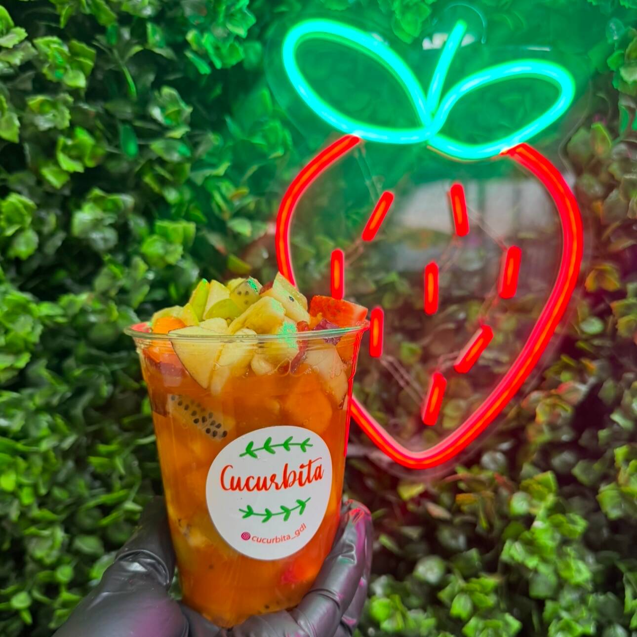 (354 ML)Coctel de Frutas (Melón, Papaya,Piña, Guayaba, Manzana,Fresa, Uva, Kiwi, Plátano), a base de jugo y granadina.