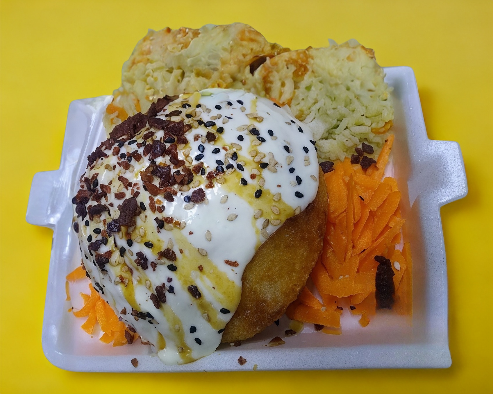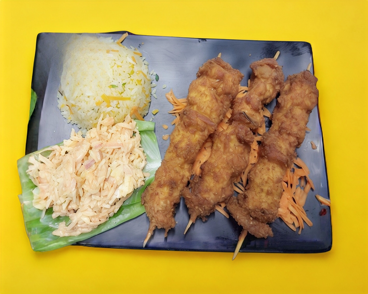 La orden trae 3 pzas. Su porción de arroz frito y ensalada de zurimi