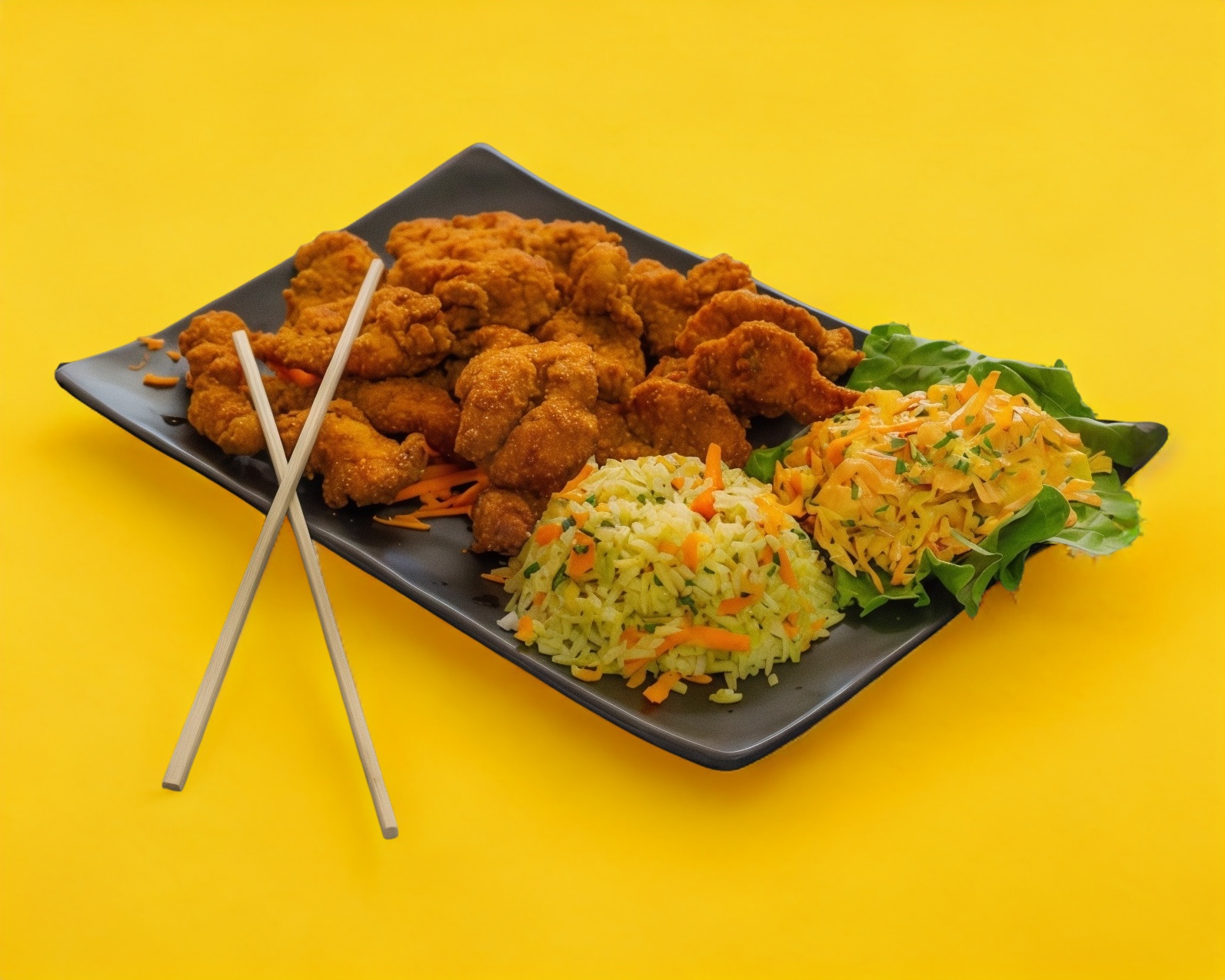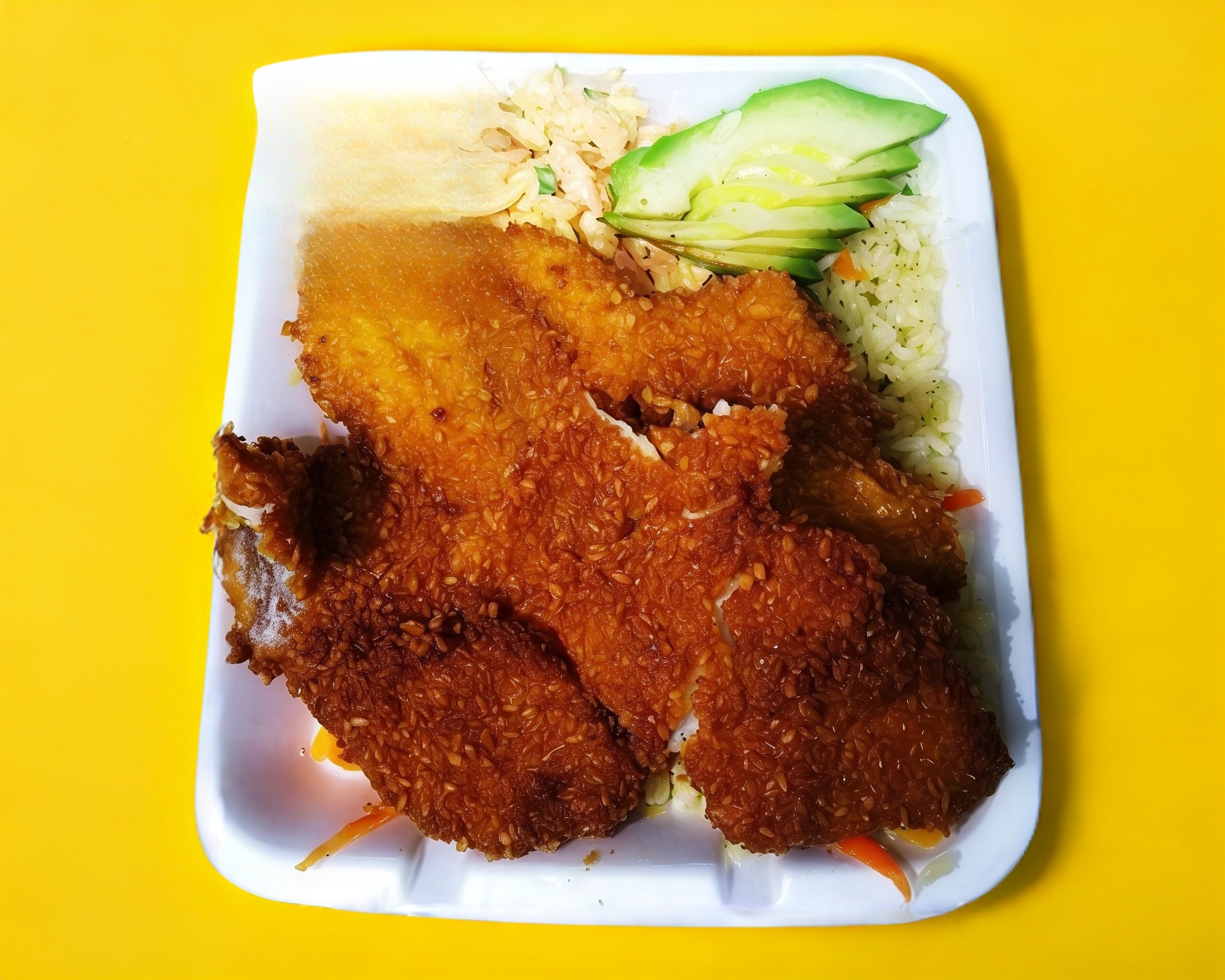 Filete empanizado con una porción de arroz y una porción de ensalada de surimi