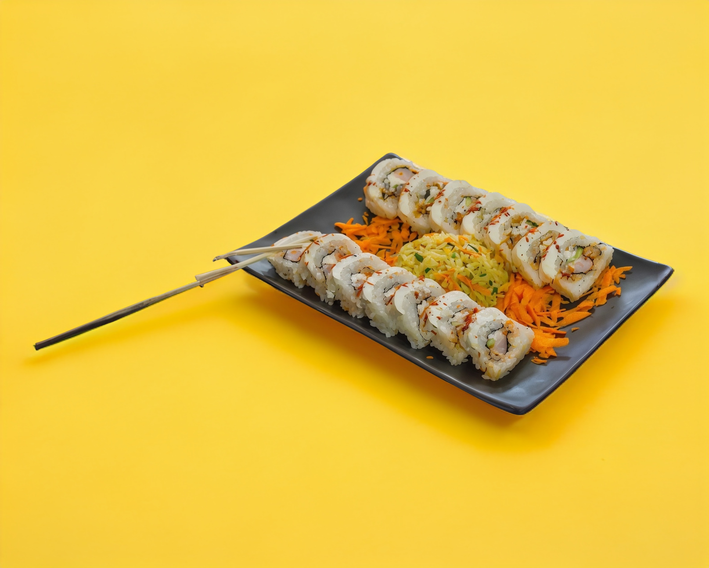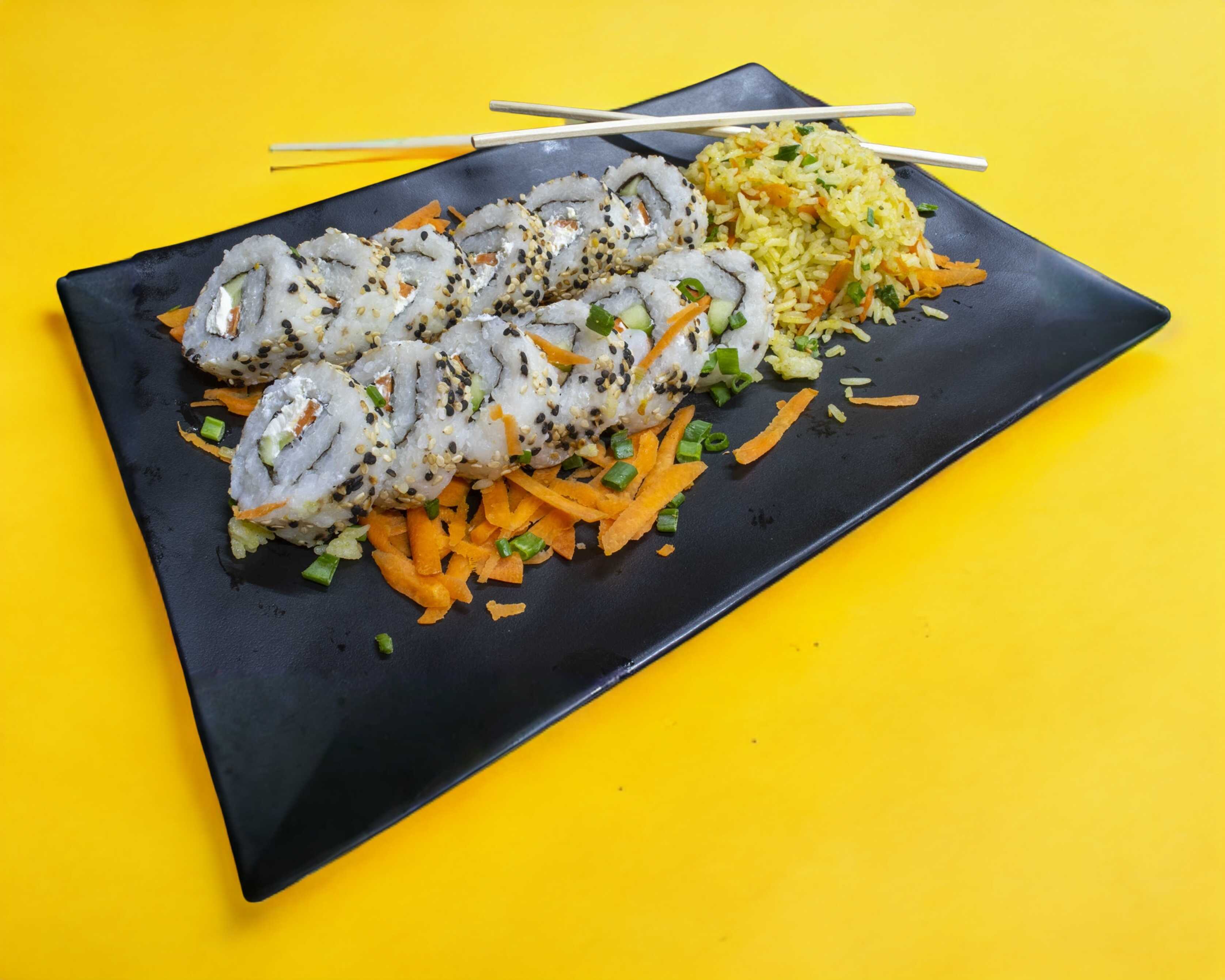 Elije tu ingrediente que quieras que lleve tu sushi y va acompañado de una ensalada de zurimi arriba del sushi