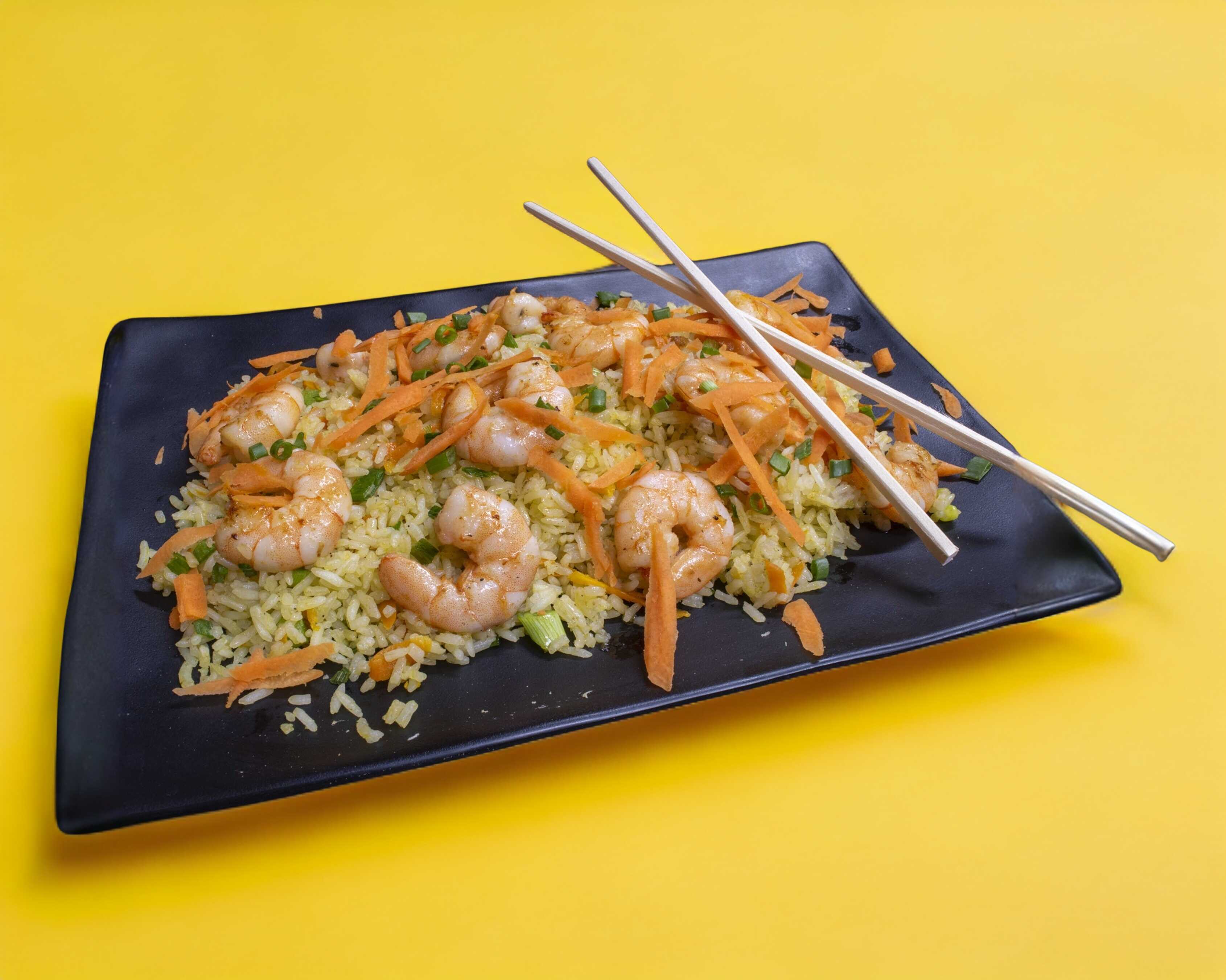 Camarones al ajo con porción de arroz y ensalada de surimi