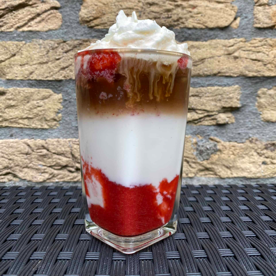 Base de salsa de fresa casera, lecche, hielo espresso doble con 30grs de chocolate semi amargo mezclado y un toque de crema batida.