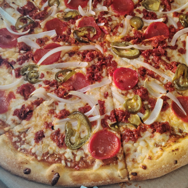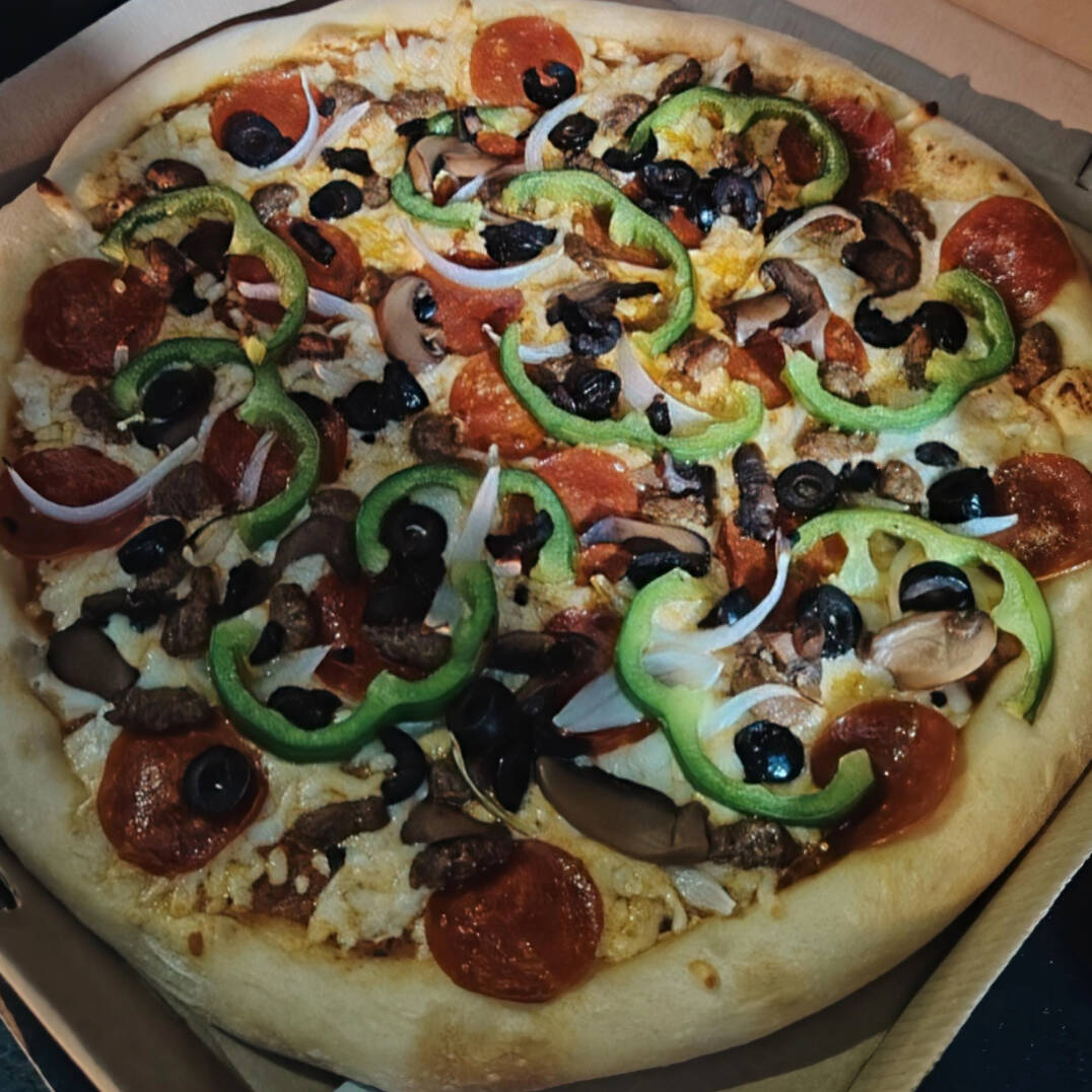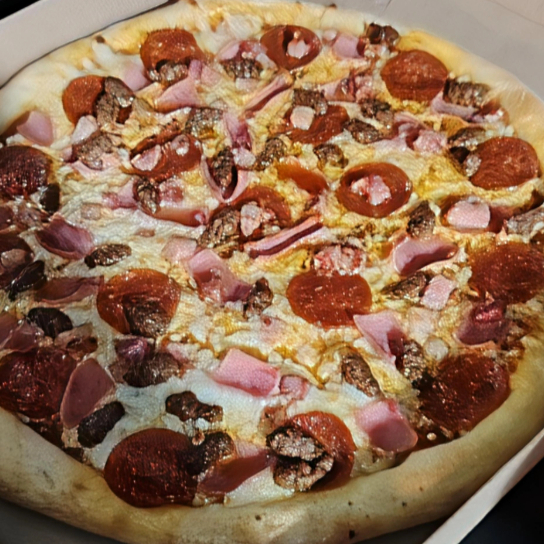 Salsa de la casa, Mezcla de quesos, Pepperoni, salchicha italiana,morron, cebolla, champiñón, aceitunas negras