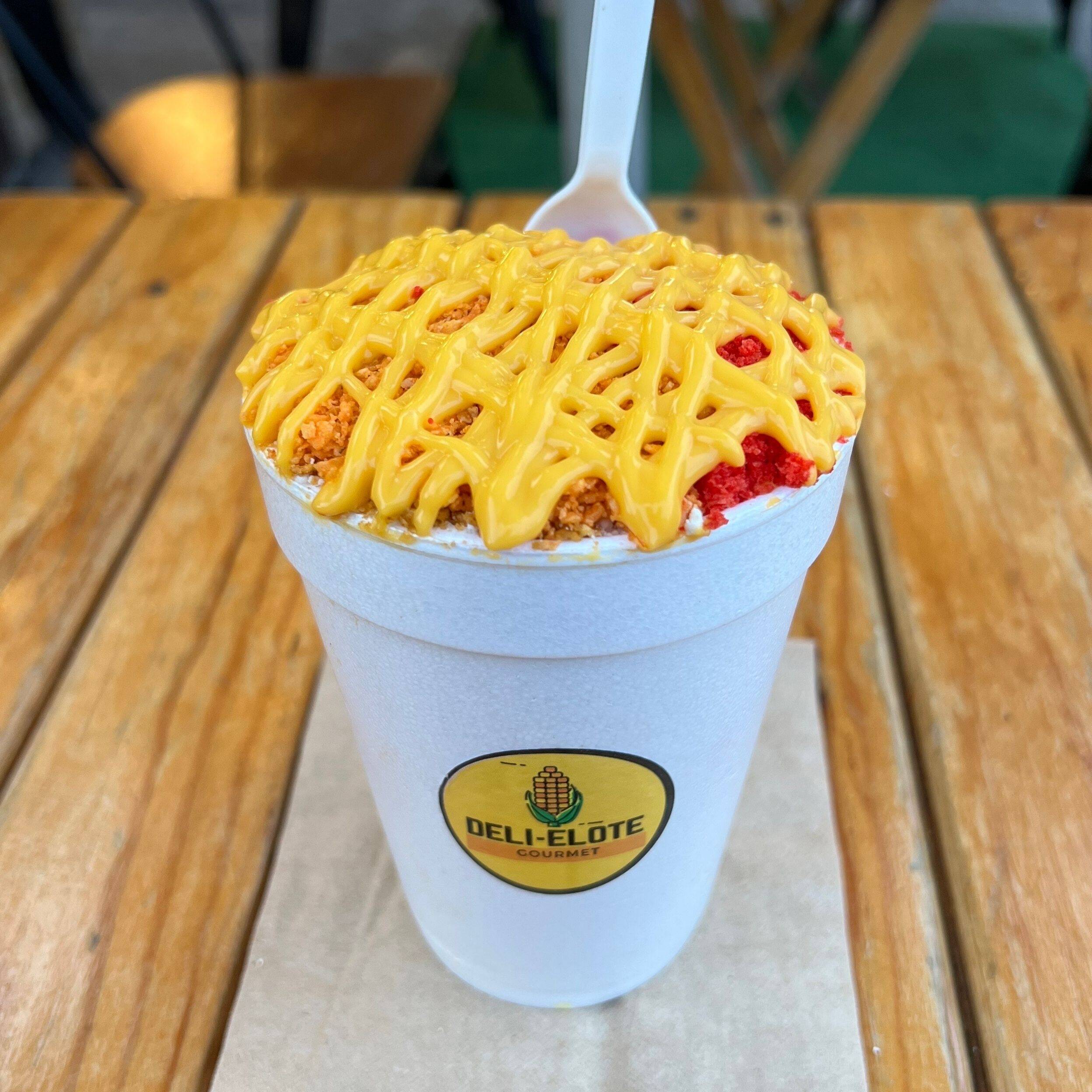Elote amarillo se manda en vaso de 14 oz, Incluye 2 aderezos, 2 quesos, 2 toppings