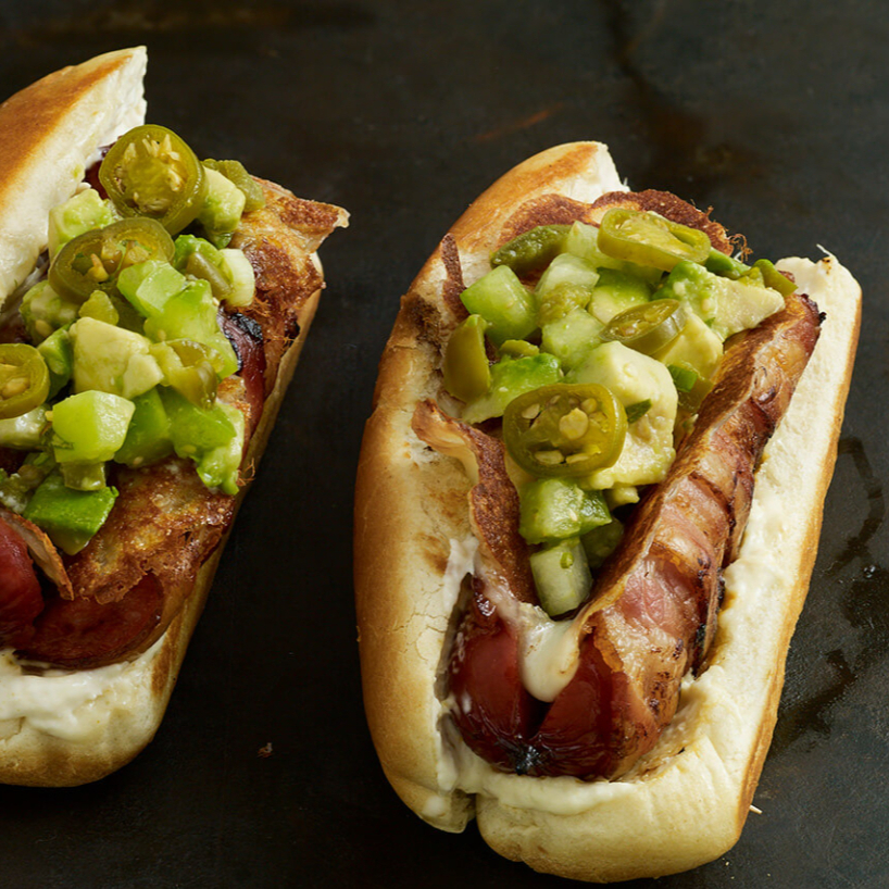 Deliciosa salchicha de pavo envuelta en tocino, tomate y cebolla