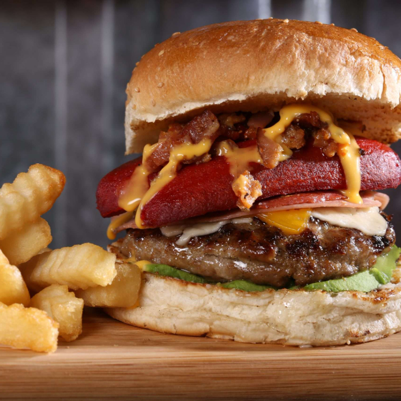 150 gr de deliciosa carne de arrachera, huevo frito, salchicha, tocino, lechuga, tomate, cebolla, aderezos y 150 gr de papa ondulada