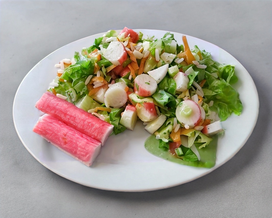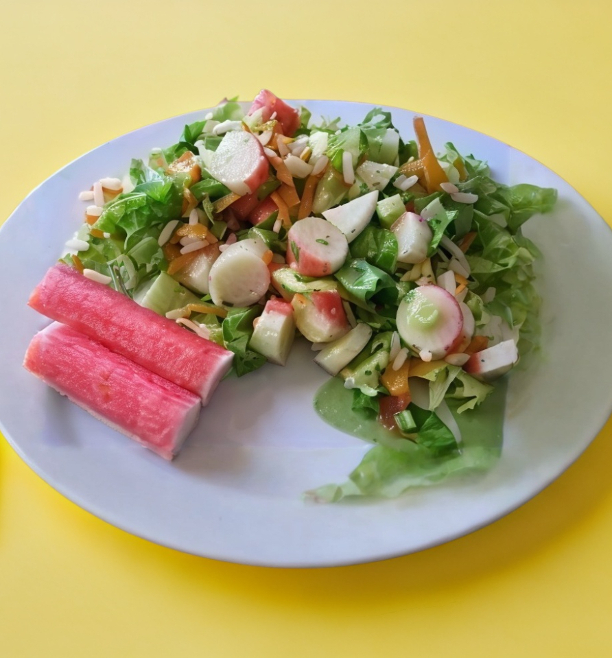 Ensalada con base de lechuga italiana, sangría, romana, espinaca, acelga, surimi y complemento, aderezo y topping a elegir.