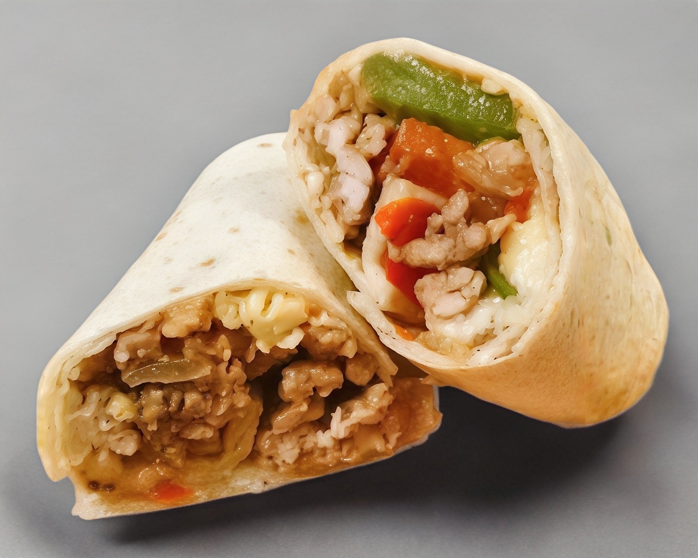 Burrito con tortilla de harina gigante, arroz, pico de gallo, lechuga, salsa de aguacate, mayonesa, queso mozzarella, ensalada individual del día y pollo. 1 Pieza.