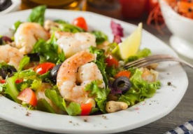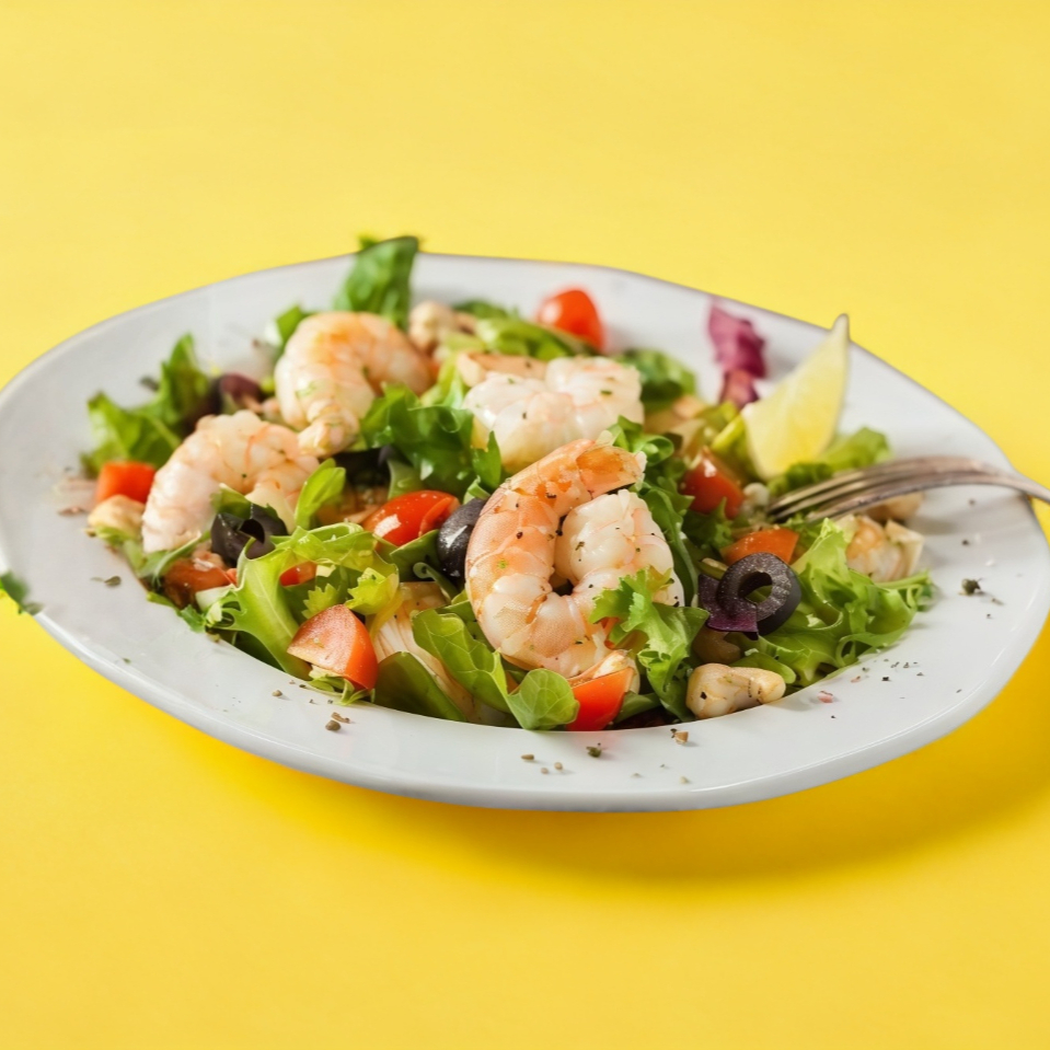 Ensalada con base de lechuga italiana, sangría, romana, espinaca, acelga, camarones, complemento, aderezo y topping a elegir.