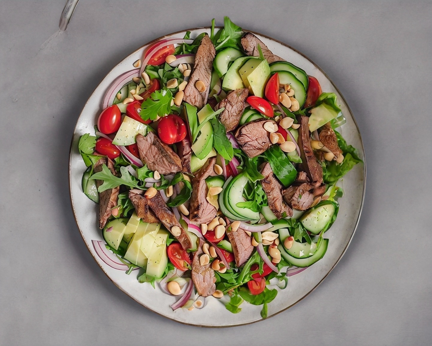 Ensalada con base de lechuga italiana, sangría, romana, espinaca, acelga, res, complemento, aderezo y topping a elegir.