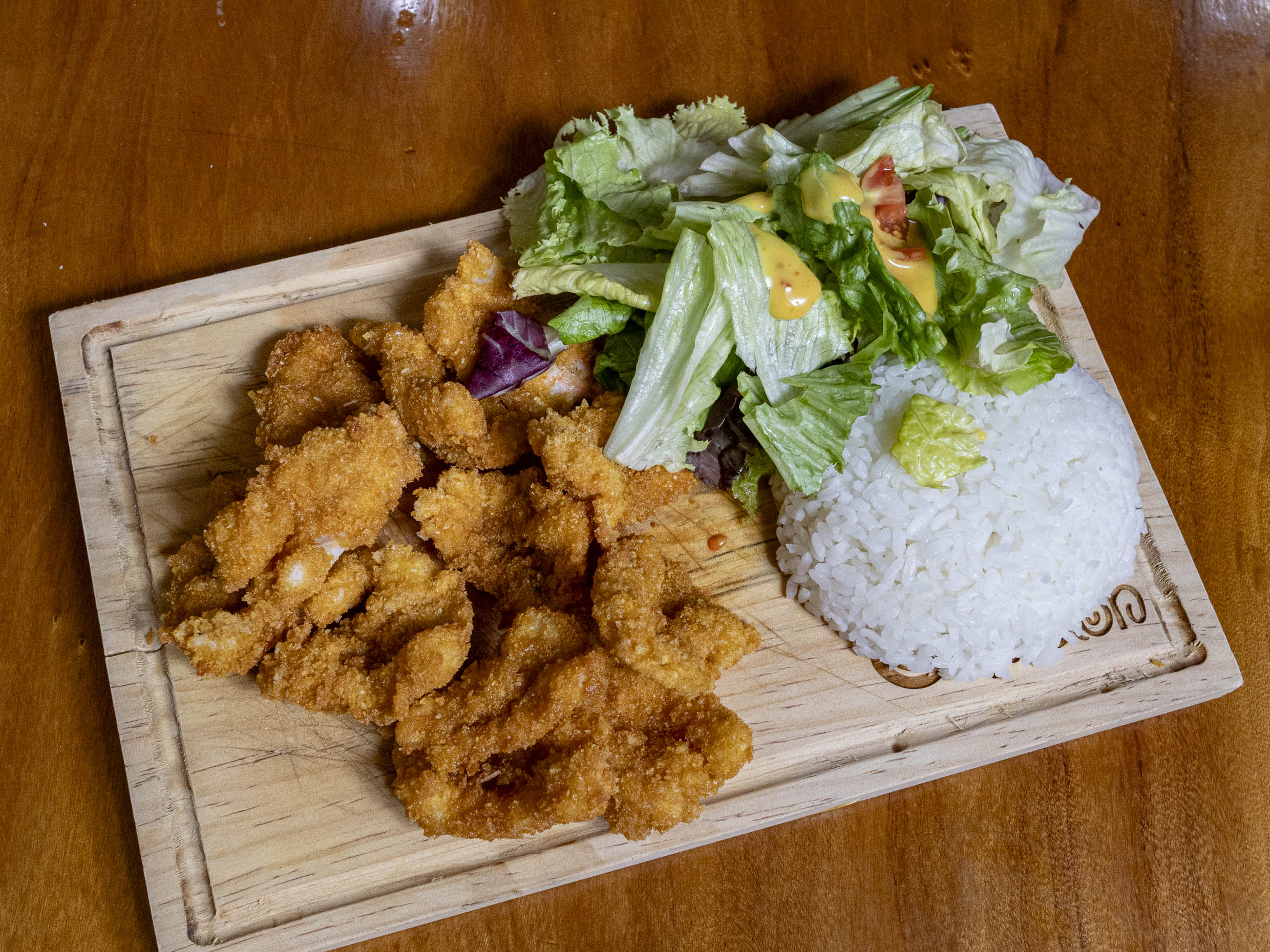 Camarones empanizados acompañados con ensalada y arroz frito