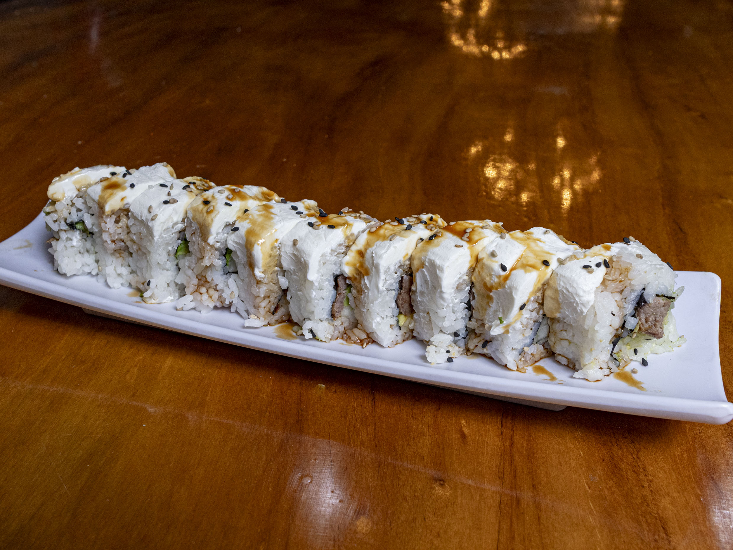 Por dentro pepino y aguacate por fuera anguila y queso philadelphia, bañado en salsa de anguila.
