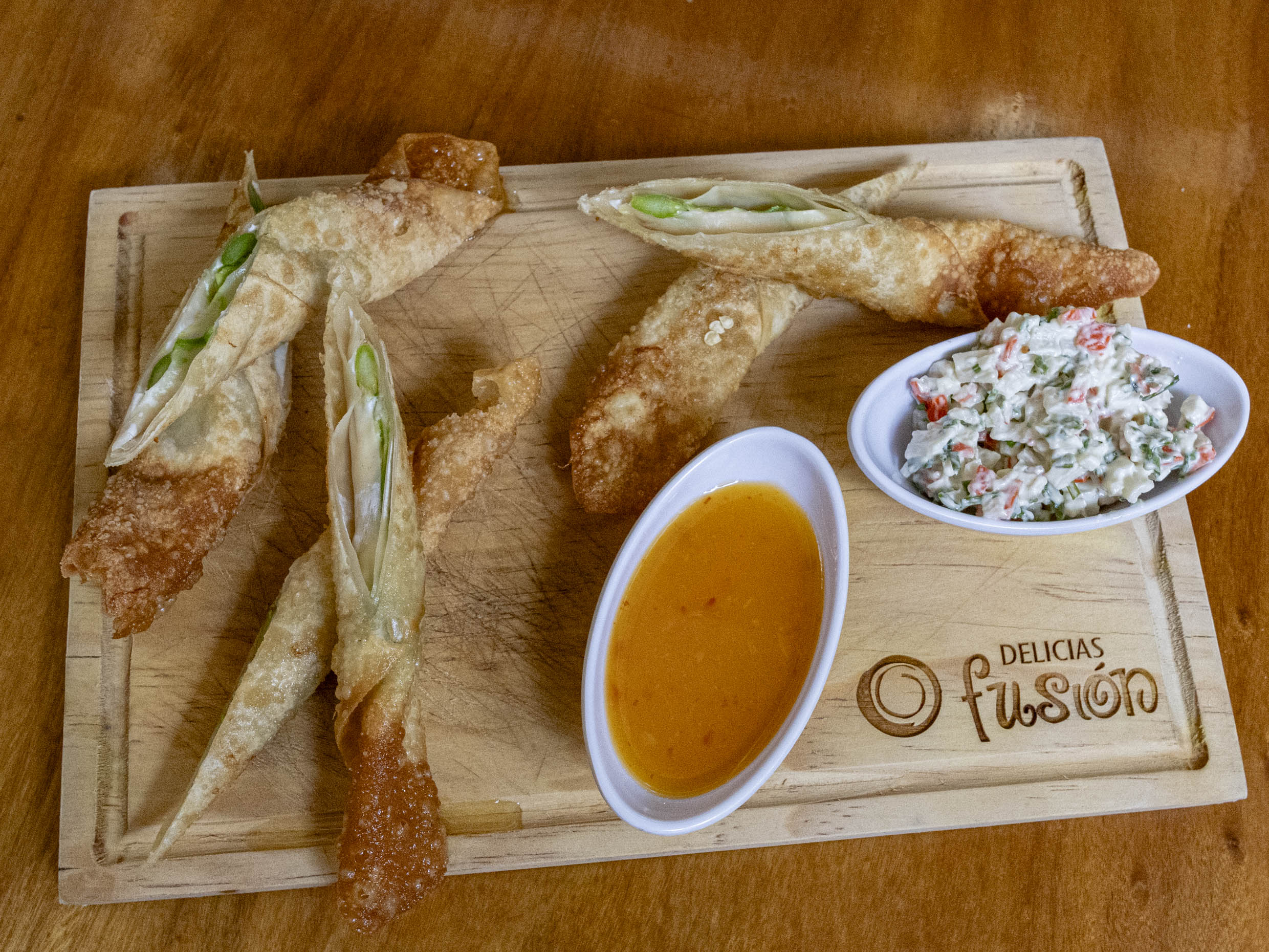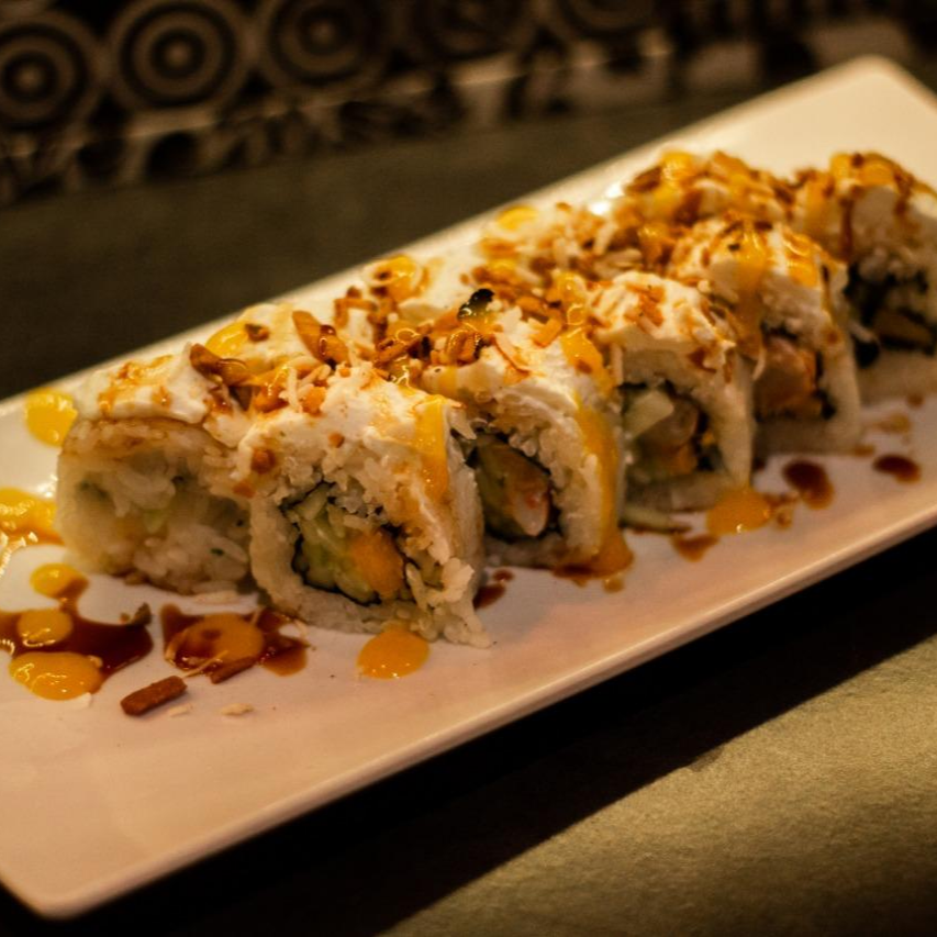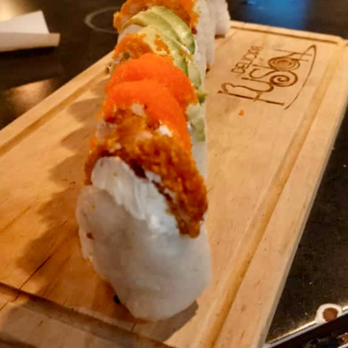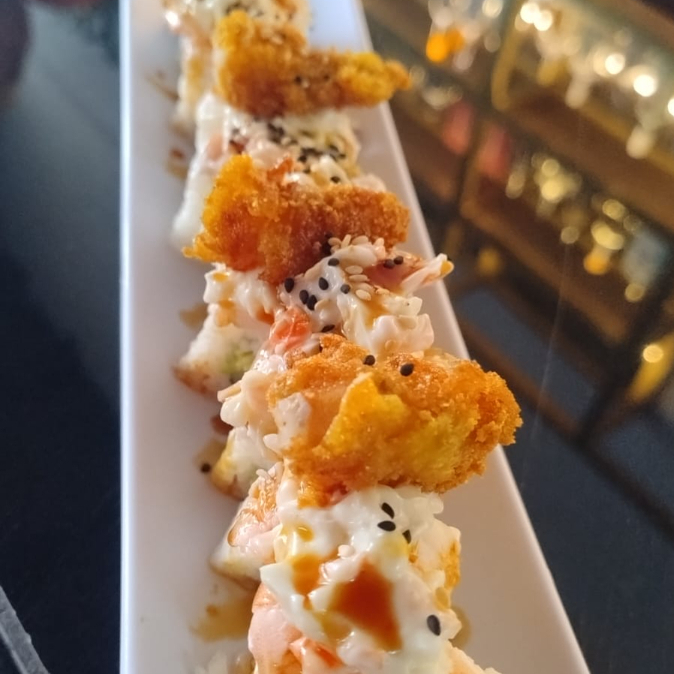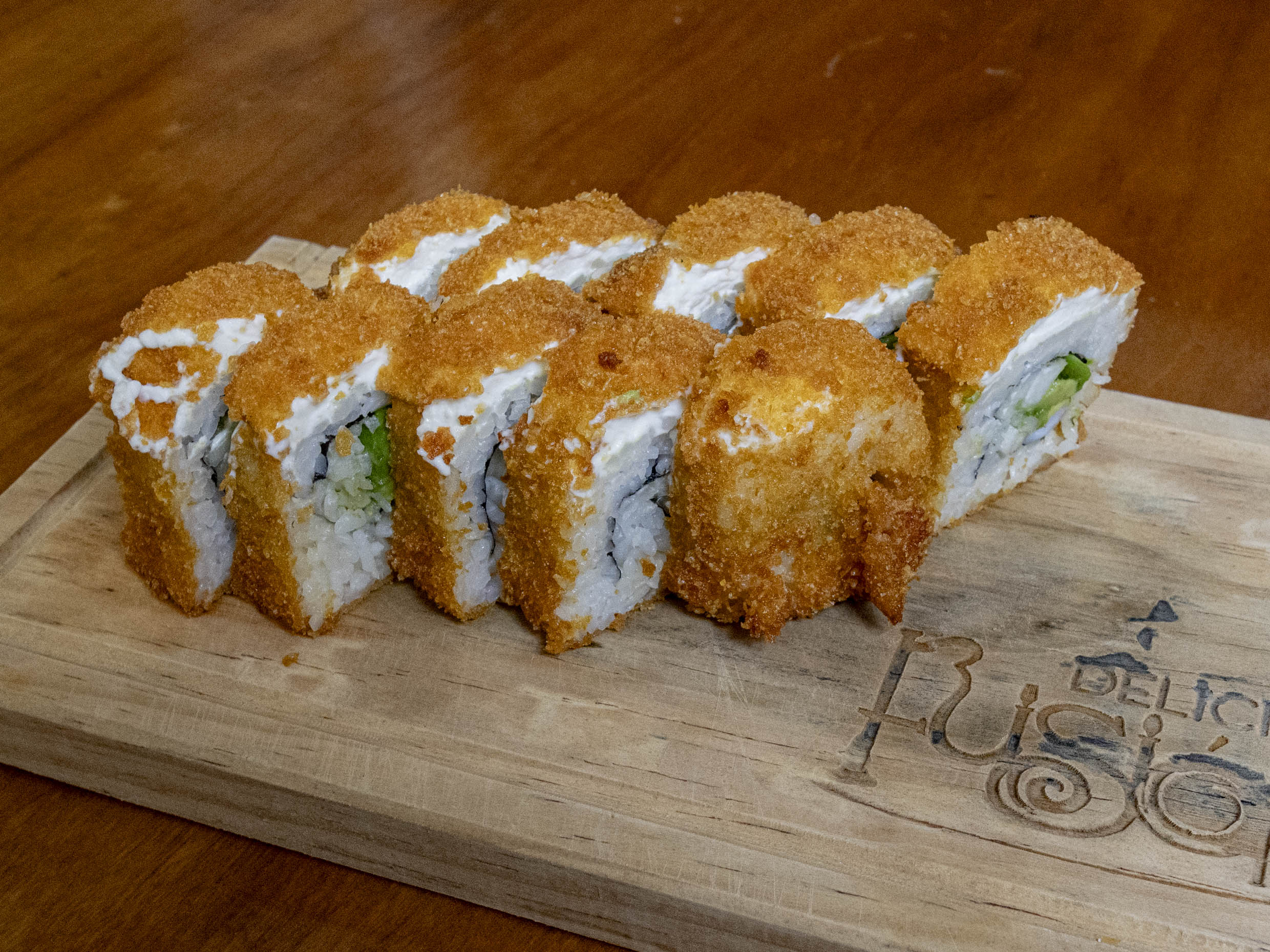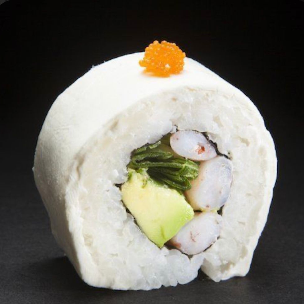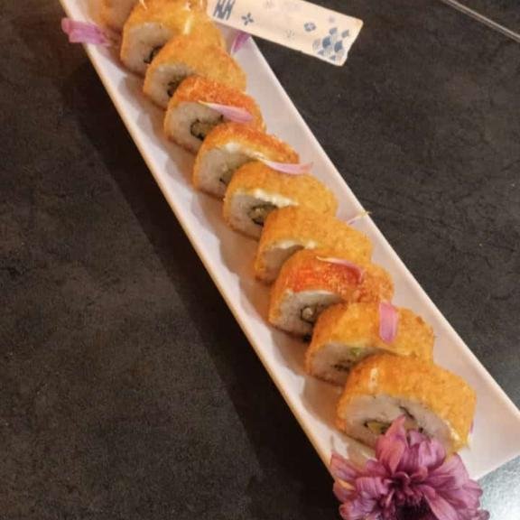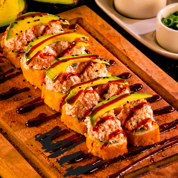 Por dentro camarón o res, aguacate, philadelphia y pepino. Por fuera empanizado ensalada de surimi y aguacate