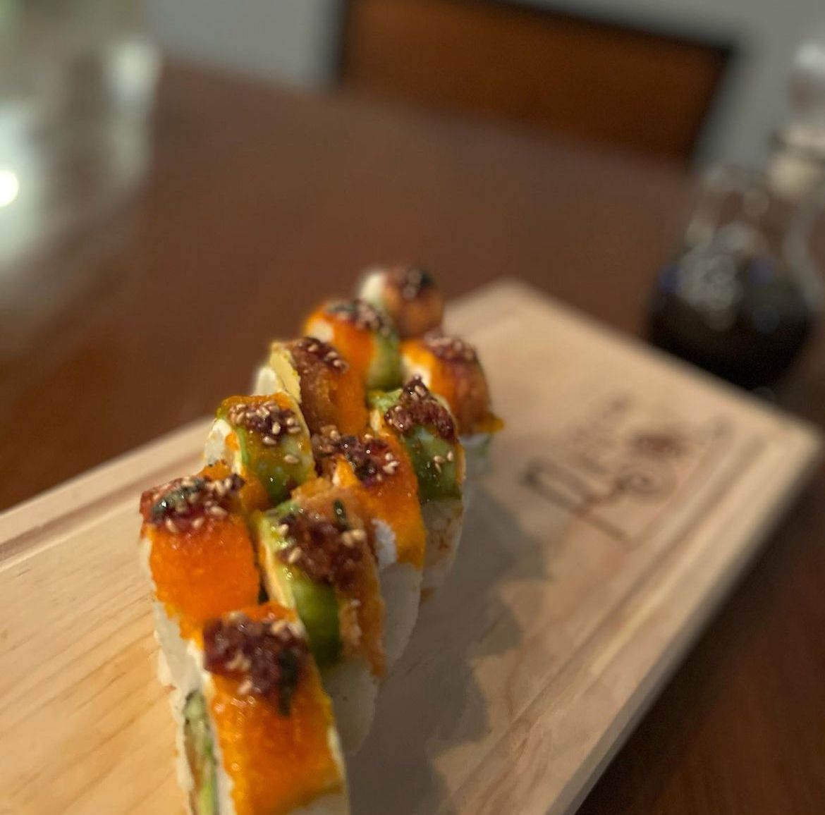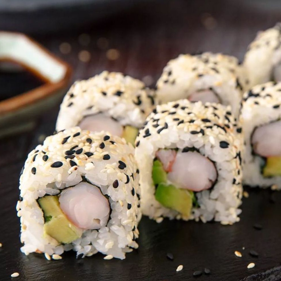 Por dentro pepino y aguacate por fuera philadelphia, aguacate, ensalada de kanikama, cangrejo empanizado, furikake salsa de anguila.