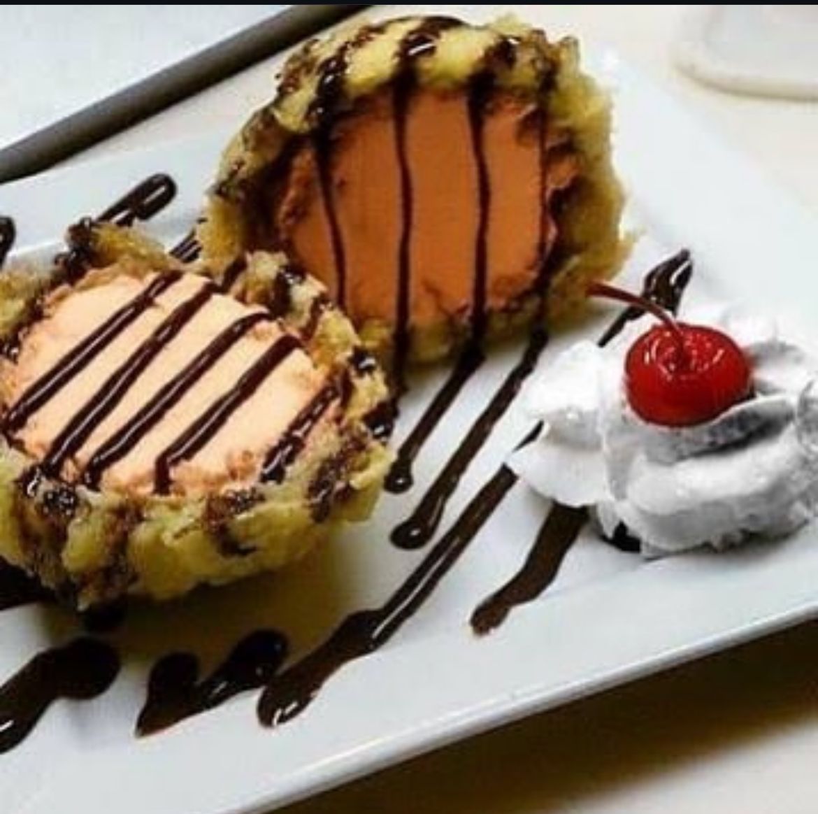 Bola de nieve empanizado con chantillí, chocolate y una cereza