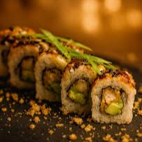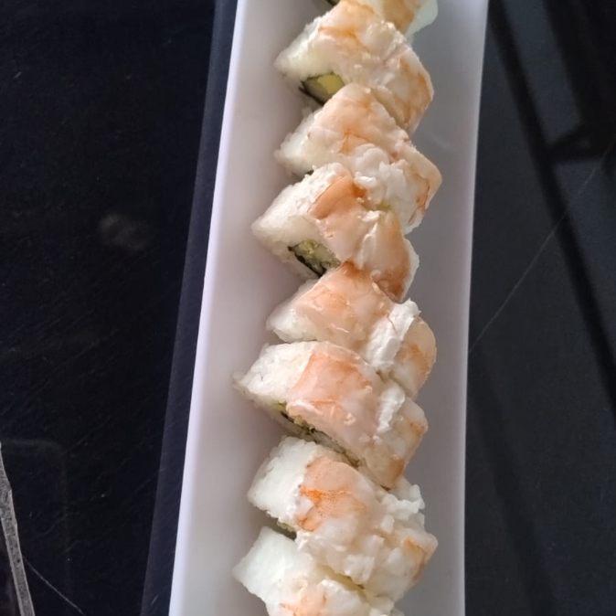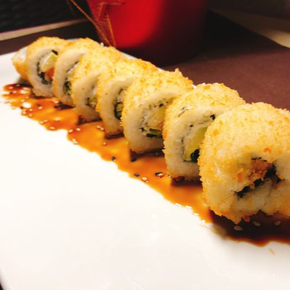 Por dentro pepino y aguacate por fuera camarón, ensalada de surimi y camarones empanizados bañados en salsa de anguila.