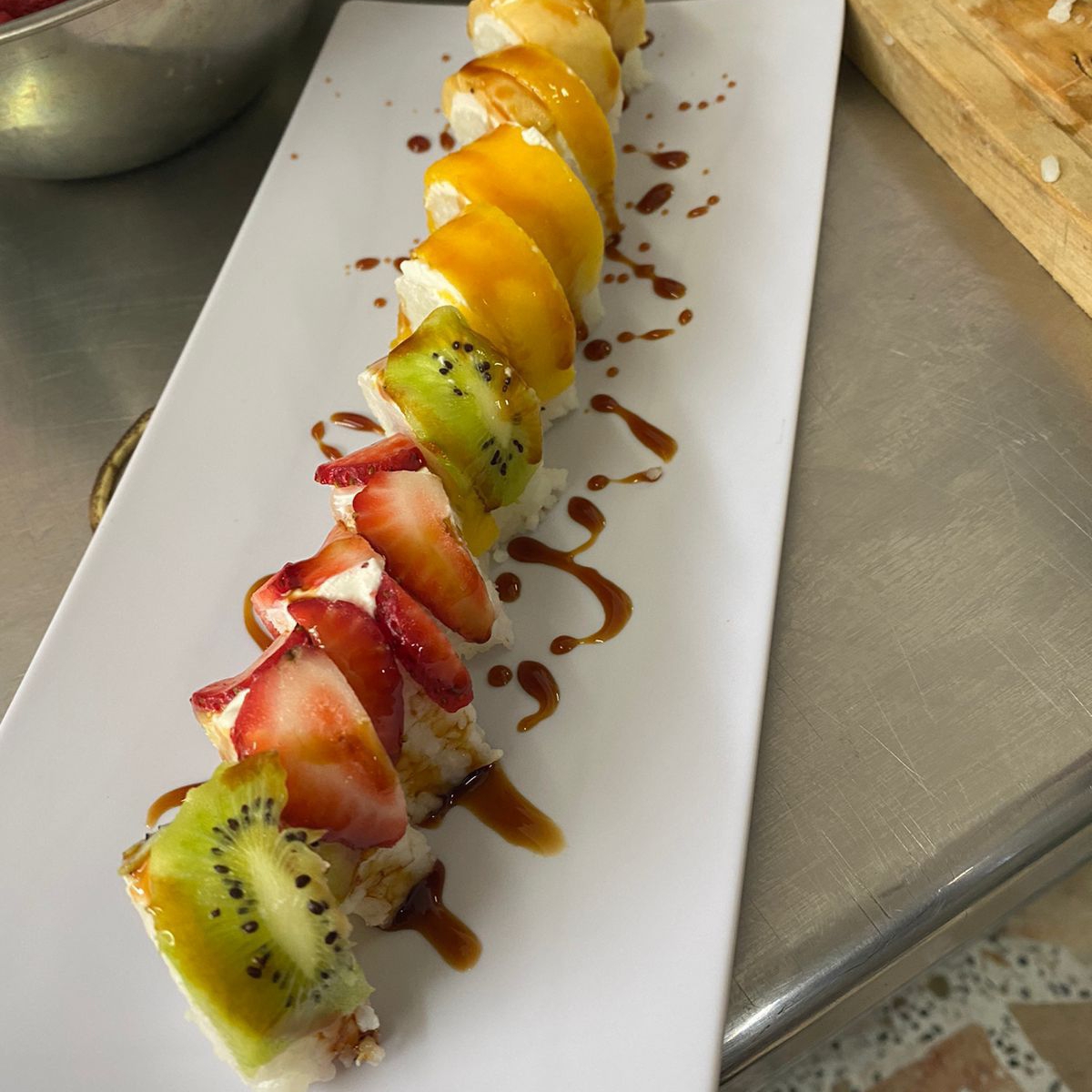 Por dentro pepino, aguacate, por fuera queso philadelphia y frutas (fresa, mango, kiwi y plátano).