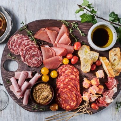 Quesos finos, peperoni, salami, jamón serrano, frutos secos, uvas y aceitunas