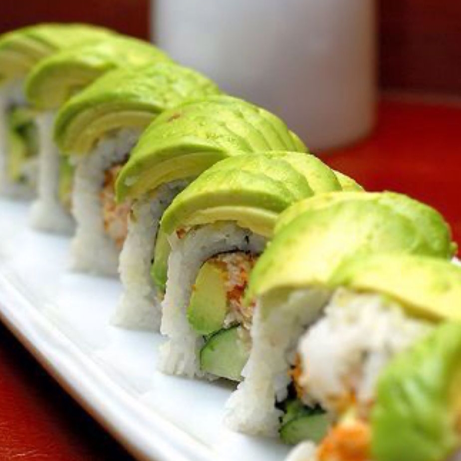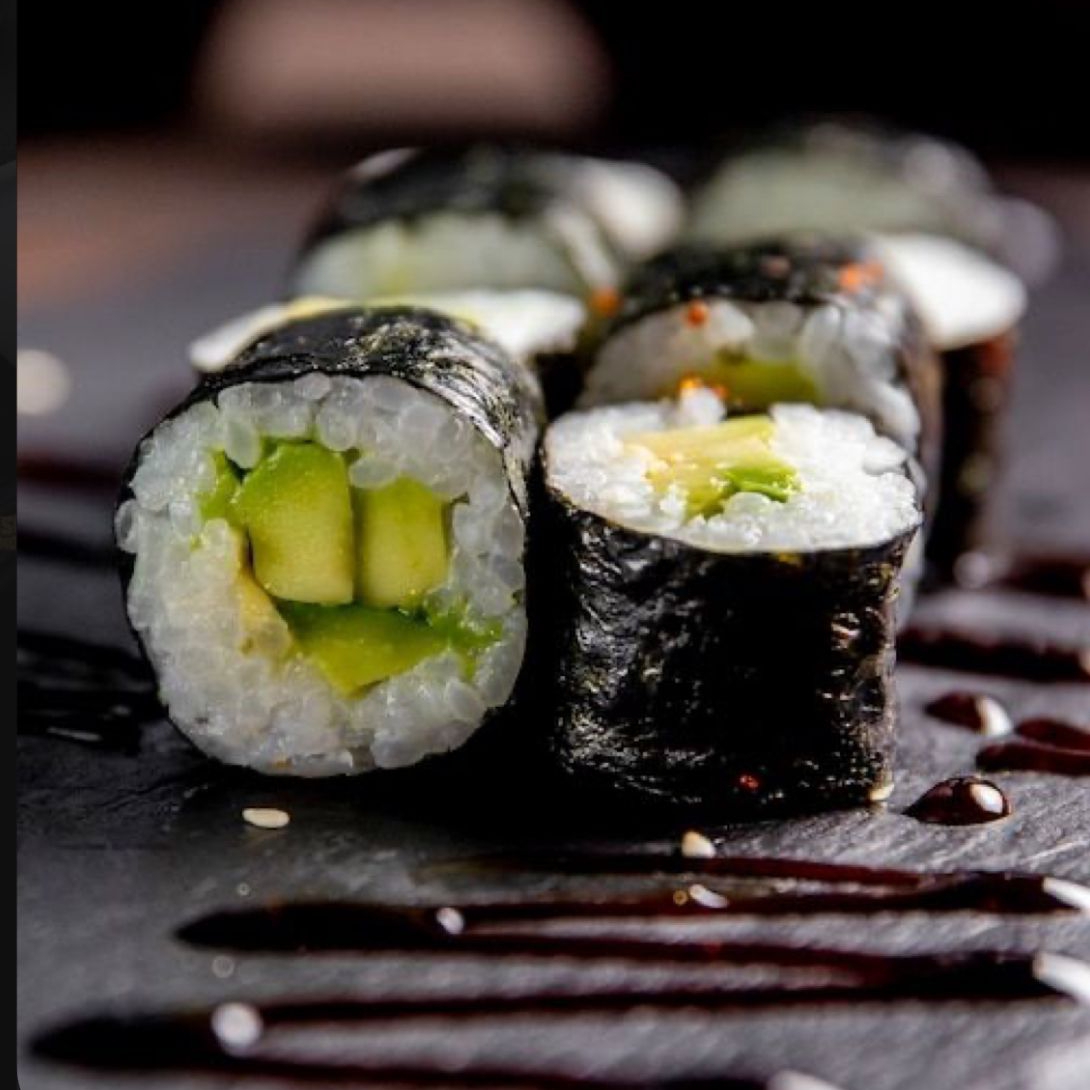 Por dentro pepino, aguacate y surimi. Por fuera aguacate, philadelphia y salmón