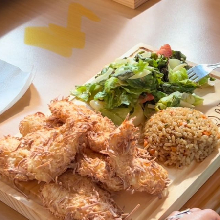Camarones al coco acompañados con ensalada y arroz frito
