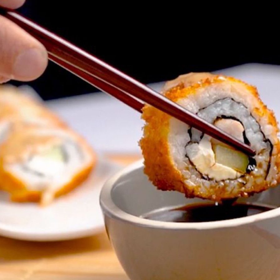 Por dentro pepino, aguacate y queso philadelphia, por fuera empanizado.