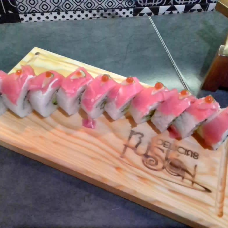 Rollo envuelto en atún importado, con 1 twist de limón, por dentro pepino y aguacate.
