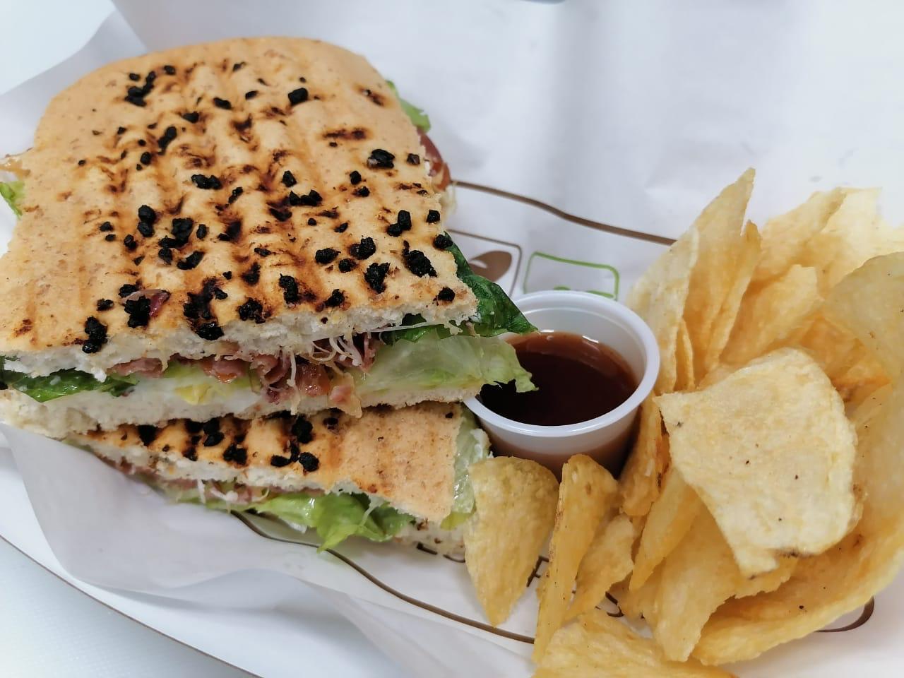Lomo canadiense, manchego, queso amarillo y jalapeño, acompañado de ensalada.