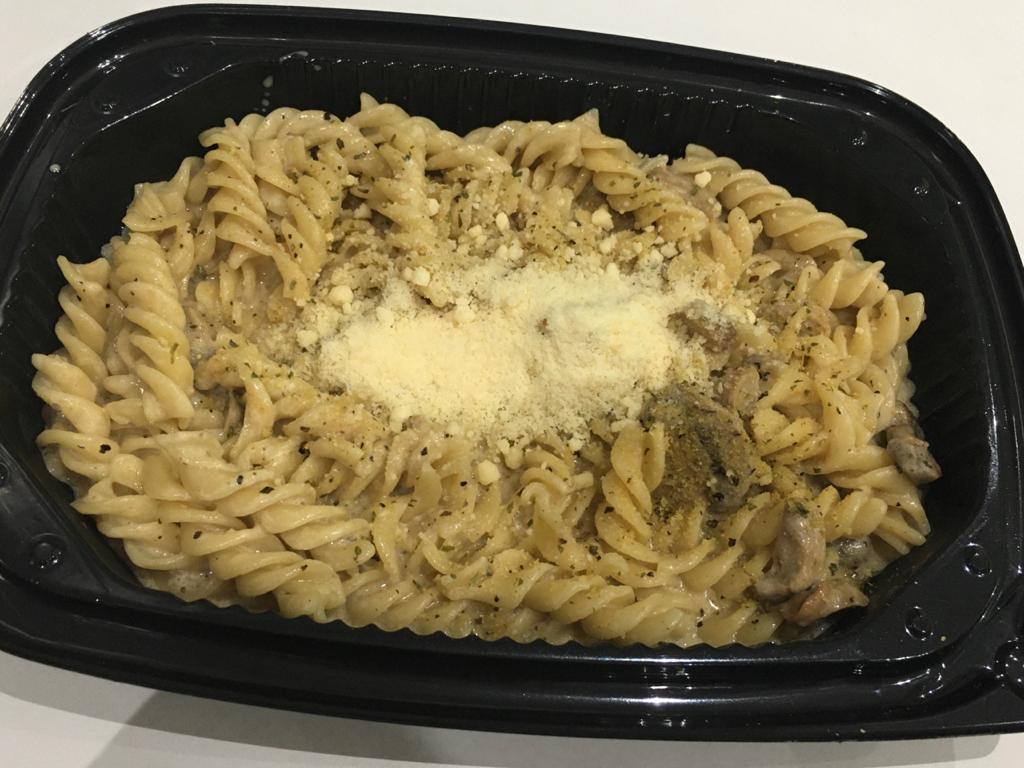 Pasta con crema, champiñon y queso gratinado.