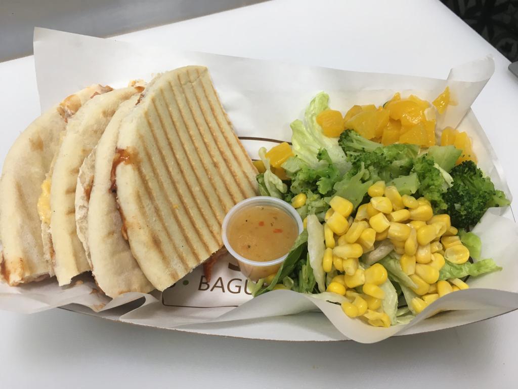 Pepperoni, manchego, queso amarillo y jalapeño, acompañado de ensalada.