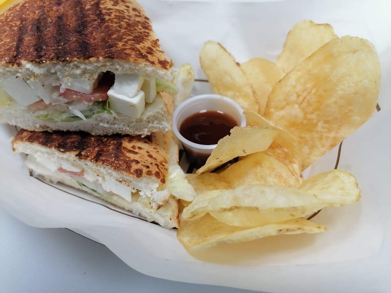 Jamón York, manchego, queso amarillo y jalapeño, acompañado de ensalada.