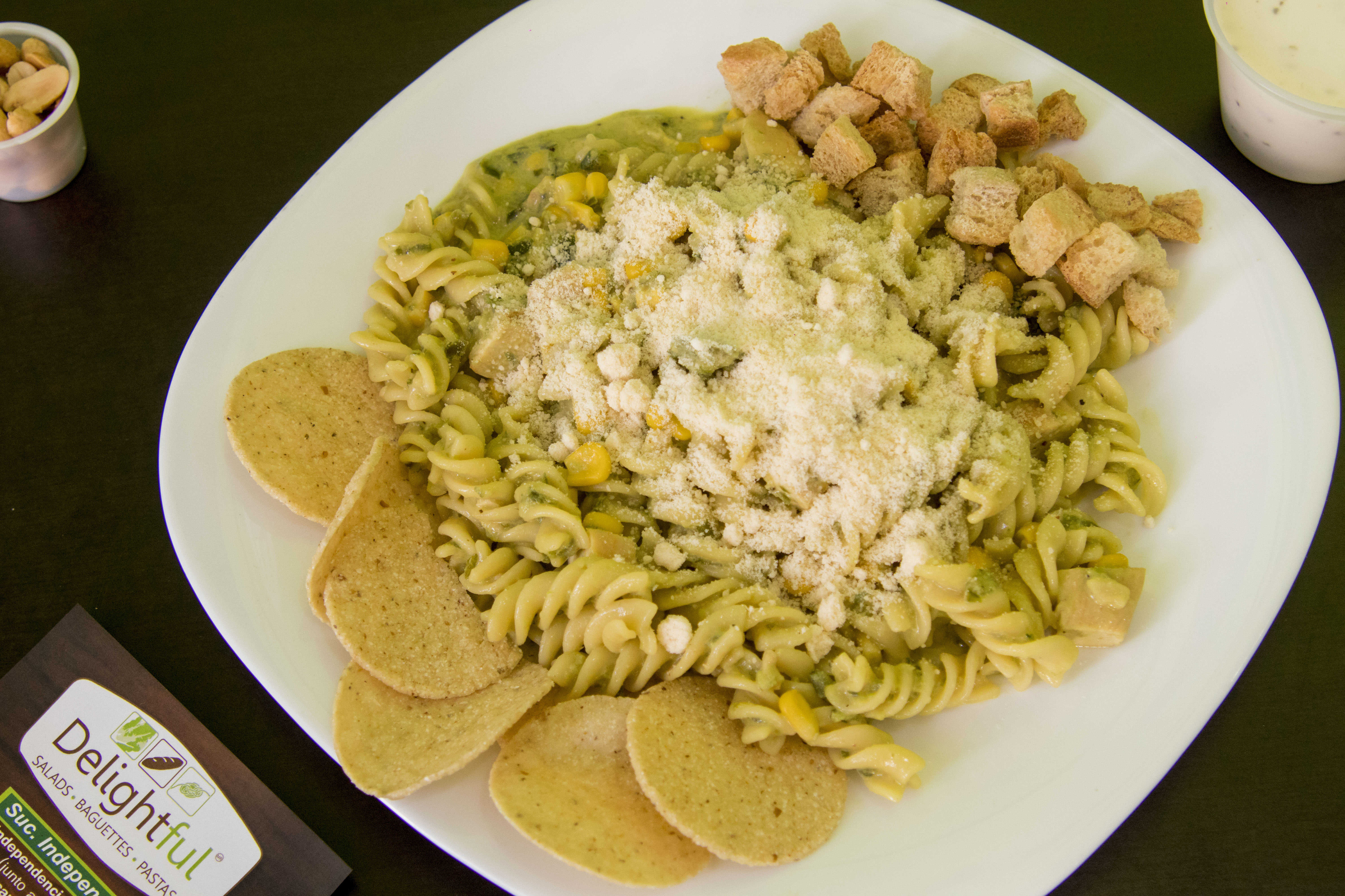 Lechuga, pasta, 80 grs de proteína, 2 ingredientes, 2 complementos y aderezo a elegir.